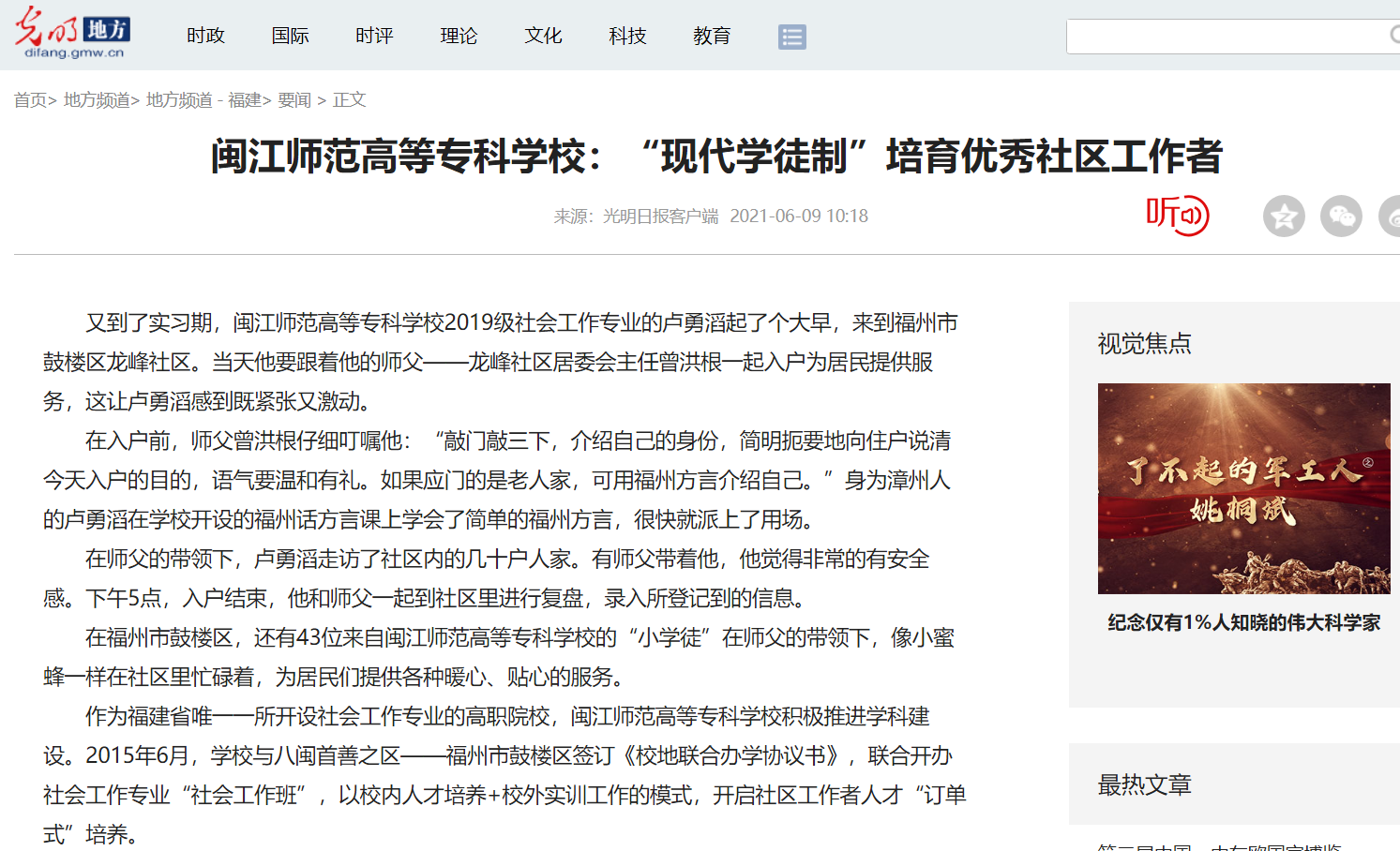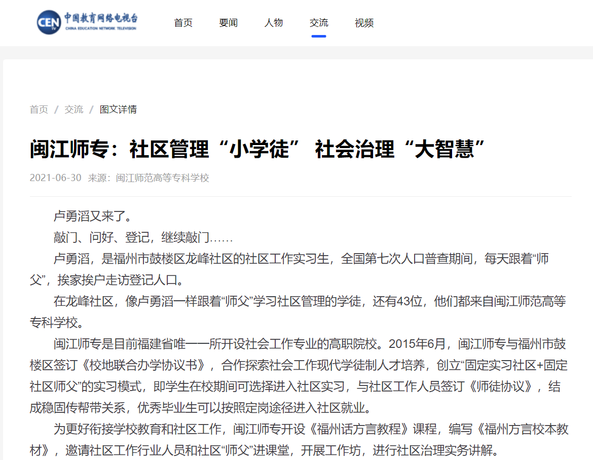 介绍了全国的情况,那么闽师专的社会工作有什么特色呢?请先看光明网和中国教育网络电视台对我们的报道。