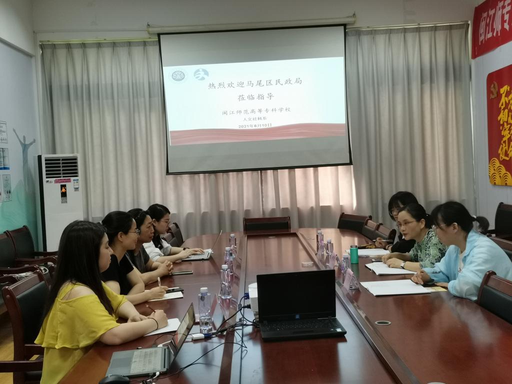 2021年6月10日,马尾区民政局社会组织管理科科长林雅、马尾区社会组织孵化基地项目负责人王燕、马尾区善邻社会工作服务中心负责人简少清到大赢家体育app下载参观并洽谈校政、校社合作事宜,人文社科系副主任陈勤(主持工作)、社会工作专业教师团队热情接待了参访人员。