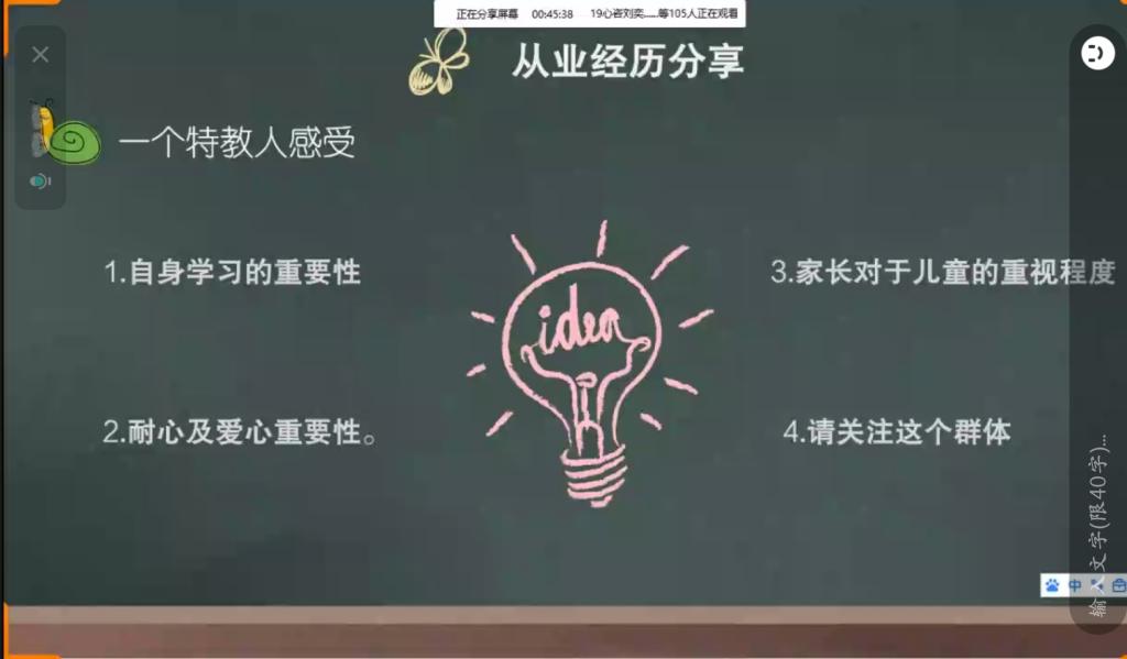 活动开始,翁洁老师首先介绍了本次活动的意义和两位嘉宾的就业背景。随后,2016级心理咨询专业优秀毕业生许林瀚从特殊教育从业者、感觉综合训练师的职业出发,科普了自闭症的相关知识,讲述了特殊教育行业的现状,分享了特教从业者的亲身感受,引导心理咨询专业的在校生对特殊教育行业有了深层次的理解。2013级心理咨询专业优秀毕业生杜林分享了心理学专业可选择的职业范围,详细讲解了如何根据自己特质找准职业定位,讲述自己的成长成才经验,引导大家从容应对心理咨询遇到的挑战。活动最后,翁洁老师对两位嘉宾表示感谢,并希望同学们可以将所学的内容应用于日常的学习生活中。