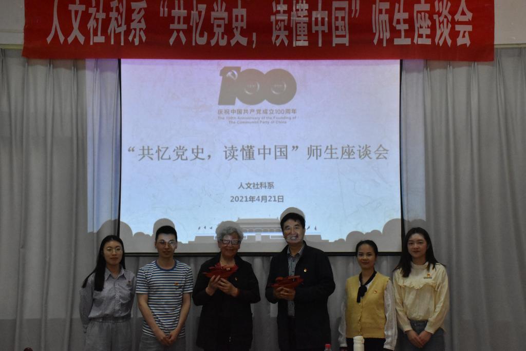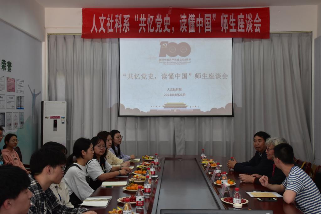 为贯彻习近平总书记在党史学习教育动员大会上的重要讲话精神,扎实推进党史学习教育,激发学生党史学习热情,4月21日,人文社科系联合校关工委组织开展了“共忆党史,读懂中国”师生座谈会。此次活动邀请了陈薇刚、黄澜两位退休教师党员与师生代表进行了深度交流座谈,座谈会由人文社科系学生党支部书记叶懿蛟主持。