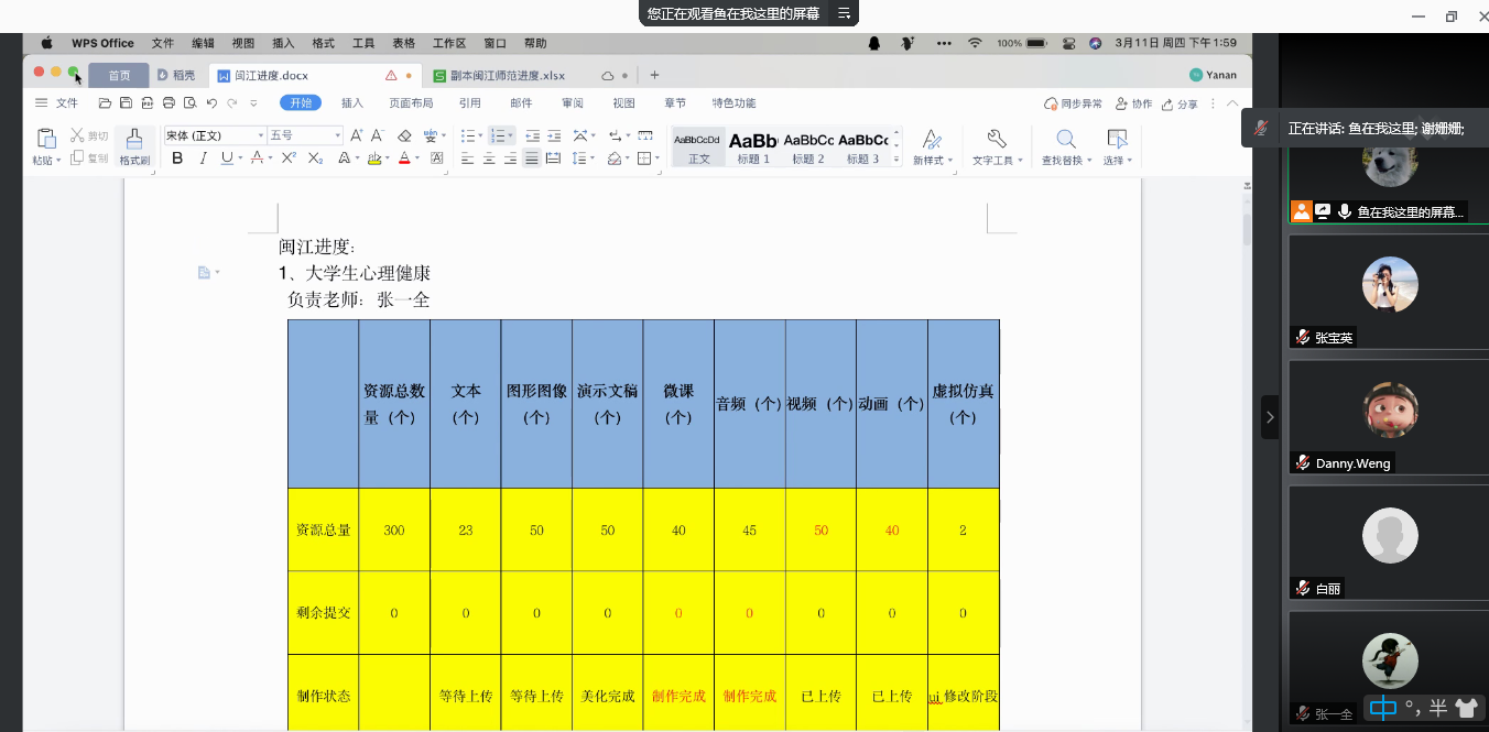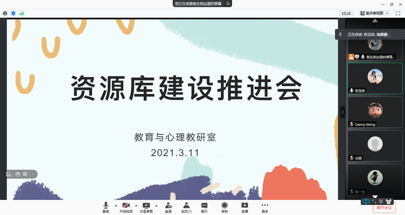 为了交流与总结心理健康教育专业省级教学资源库建设经验,进一步推动资源库项目的总体建设进度,按时保质保量完成建设任务,3月11日,人文社科系教育与心理教研室在腾讯会议召开了心理健康教育专业省级教学资源库建设线上推进会。本次会议由教研室主任谢姗姗老师主持,全体课程负责教师参加。