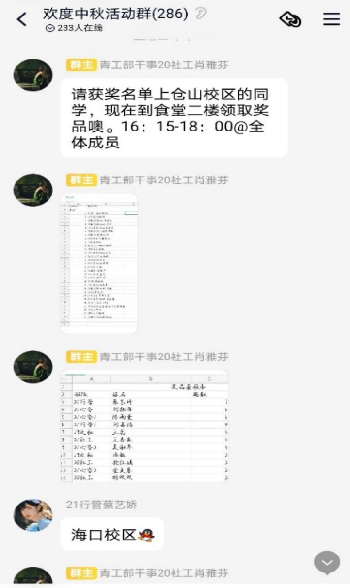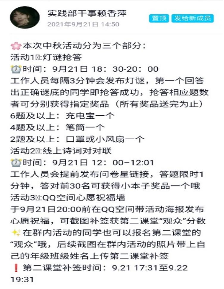 本次活动围绕‘浓情中秋共欢度,情系人文你我他”主题展开,“灯谜抢答"、“线上诗词对对联”、“QQ空间心愿祝福”三个部分,根据疫情防控需要,本活动全部采取线上形式,令全体师生在校也能感受到中秋的氛围。9月21日,三个部分活动在线上如火如荼地进行,同学都积极的参与其中。活动结束后,对部分积极同学进行了线下奖品分发。