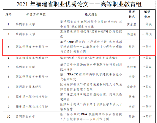 近日,福建省职业技术教育中心举办的2021年福建省职业教育优秀论文获奖名单已出。本年度福建省职业教育优秀论文经各有关单位推荐申报,福建省职业技术教育中心组织专家评审、审核,共产生职业教育优秀论文442篇,高等职业教育组117篇,其中一等奖23篇,二等奖36篇,三等奖58篇。我系三位老师分别获一、二、三等奖各1篇,硕果累累。翁洁老师立足本专业课程《心理咨询理论与实务》,基于OBE理念提出“三段五步三评”信息化教学模式,获高等职业教育组一等奖。