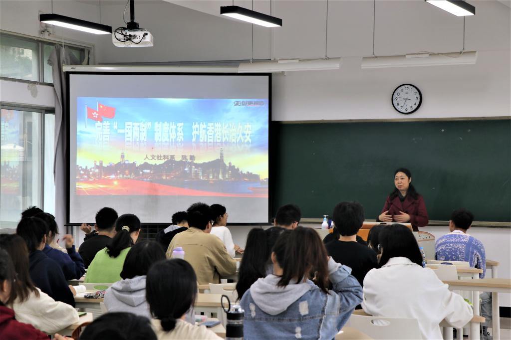 11月22日上午,人文社科系副主任(主持工作)陈勤在仓山校区3-501教室为我系21心理咨询1班的学生讲授形势与政策课,本次主讲的专题为《完善“一国两制”制度体系,护航香港长治久安》。