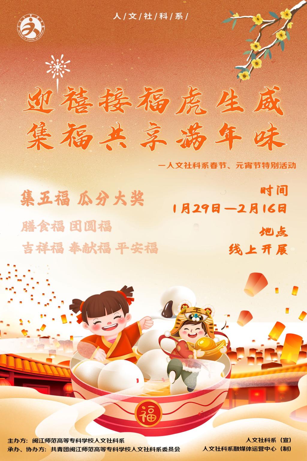 “爆竹声中一岁除,春风送暖入屠苏”。为彰显“辞旧迎新,憧憬未来”的文化内涵,营造喜庆祥和的年味氛围,增强学生对中华优秀传统文化的认同感和自豪感。2022年1月29日-2月16日,人文社科系于线上开展了以“迎禧接福虎生威,集福共享满年味”为主题的春节、元宵节特别活动。