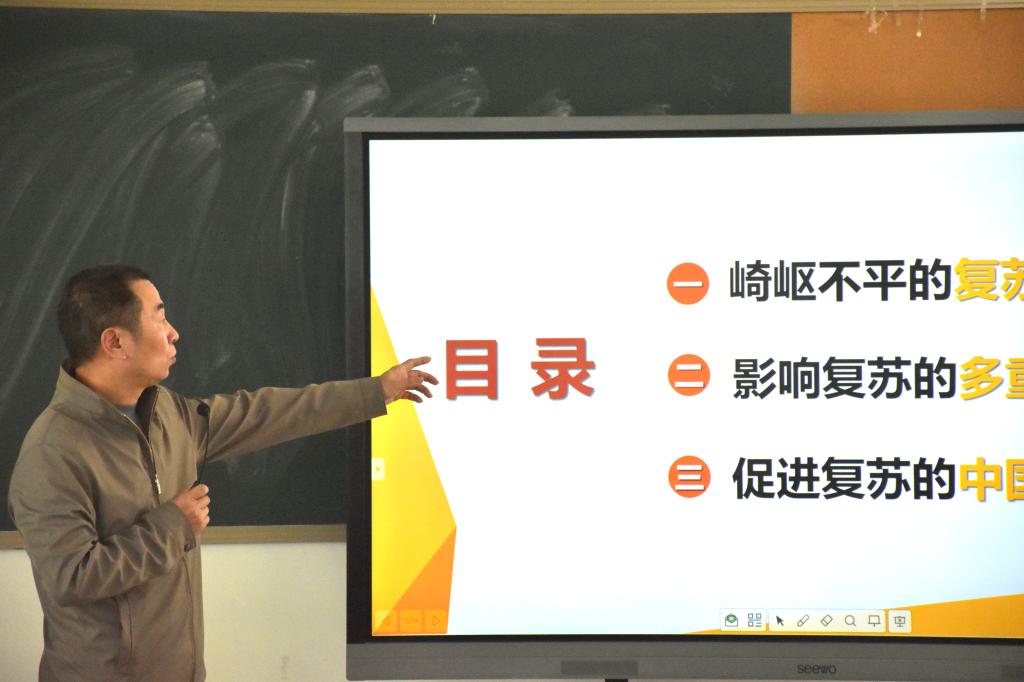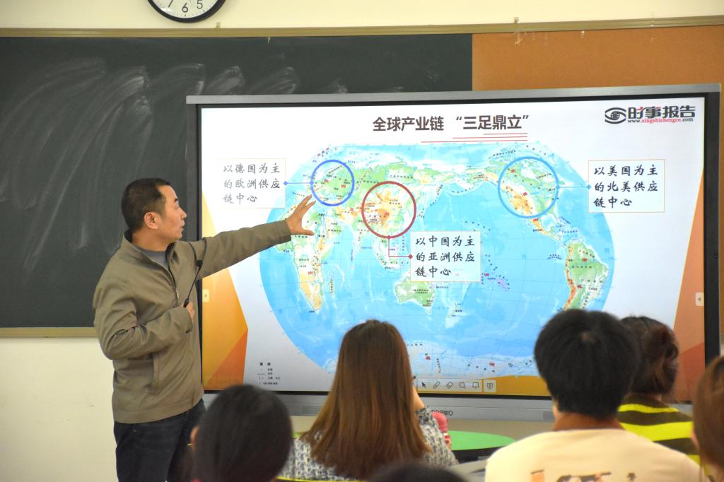 林朝阳书记首先用“疫情对世界经济的影响”引发同学们的对世界经济现状的思考,接着以“崎岖不平的复苏之路”、“影响复苏的多种因素”、“促进复苏的中国动力”三个切入点为同学们带来了精彩的一课。林朝阳书记借助新闻时事向同学们分析了经济复苏分化失衡的原因:起伏不定的全球疫情,影响深远的“逆全球化”思潮,加大外溢风险的“放水”政策等,让同学们深入了解到复苏世界经济的困难性。林朝阳书记语言生动,条理清晰,举例充分恰当,使同学们保持强烈的好奇心及注意力。