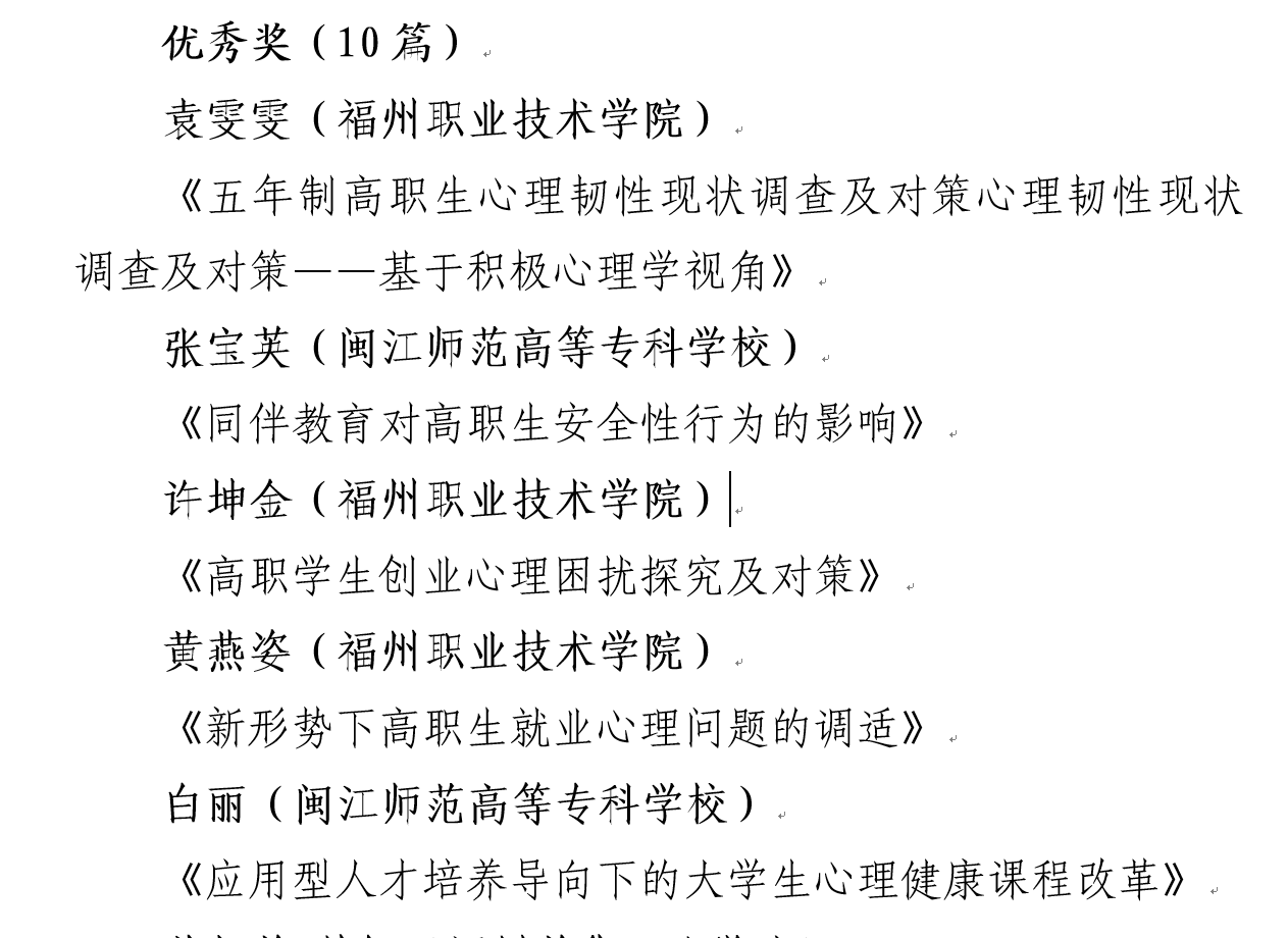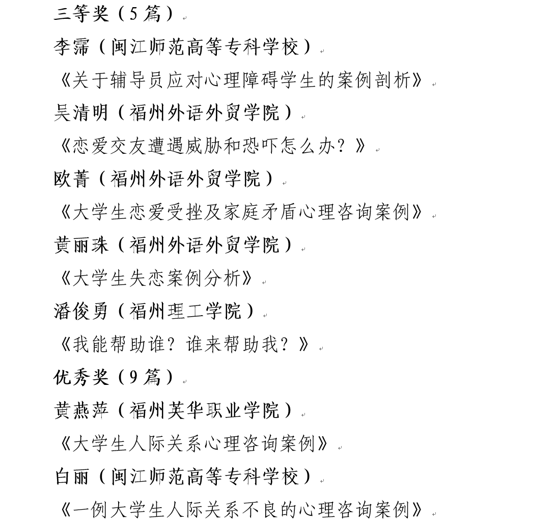 会议充分肯定了各高校疫情防控期间大学生心理健康教育与咨询工作,对2020年度心理健康优秀论文及工作案例进行了表彰,优秀老师们相互分享经验、模式。会议还邀请了福建师范大学心理学院郭明春副教授作题为“在认知行为疗法中整合正念”的专题讲座。大赢家体育app下载心理咨询专业白丽、李霈、张宝英老师报送的论文及工作案例获得了两个三等奖、两个优秀奖共4个奖项。