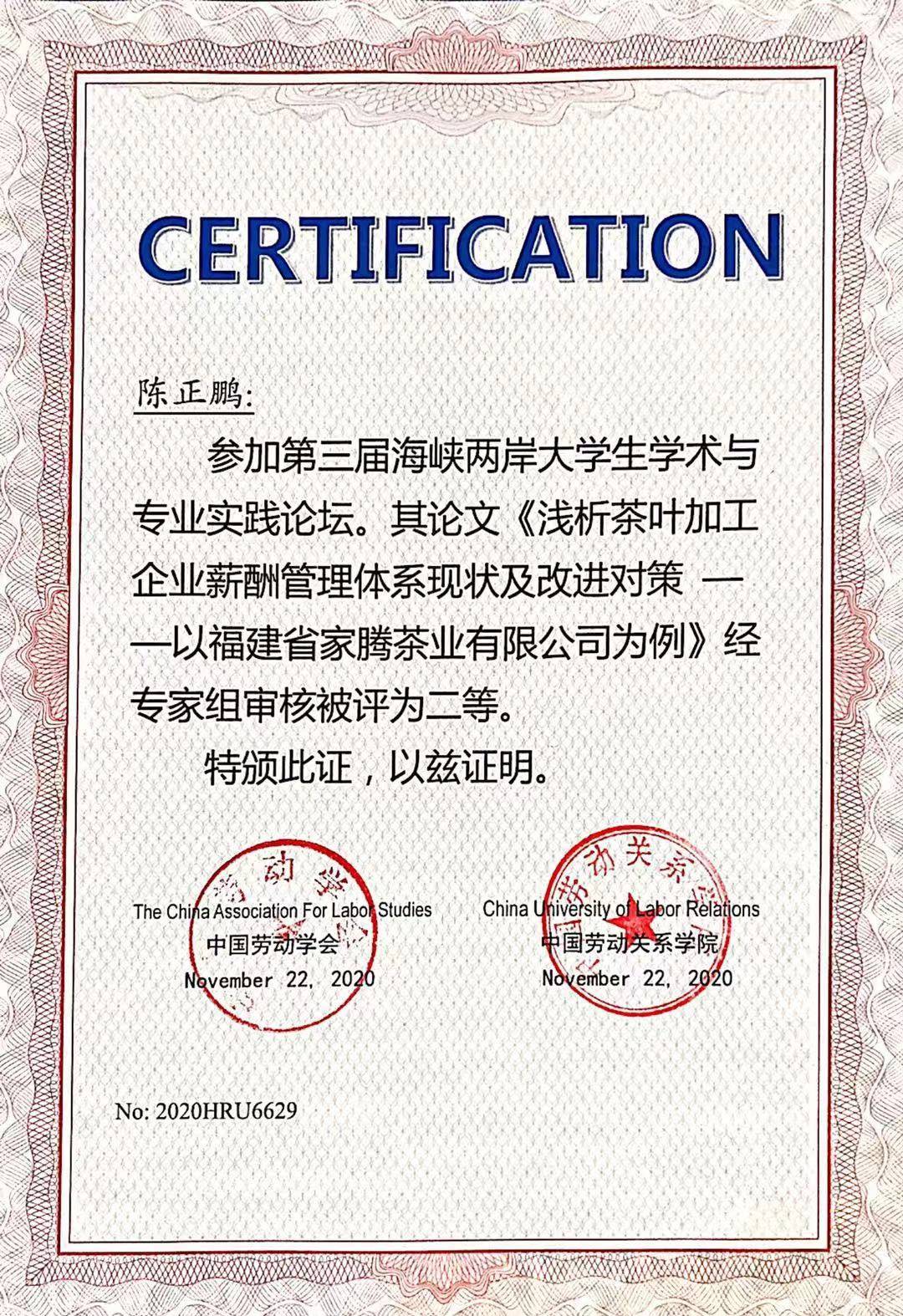 12月2日,第三届海峡两岸大学生学术与专业实践论坛活动圆满结束,本次活动由中国劳动学会、中国劳动关系学院主办,通过学生线上投递论文报告、论文路演ppt的方式进行,参赛院校为中国大陆本科、专科院校和中国台湾本科院校。其中我系行政管理专业袁曦老师指导18级行政管理专业学生陈正鹏在本次论坛中获得论文二等奖的佳绩。