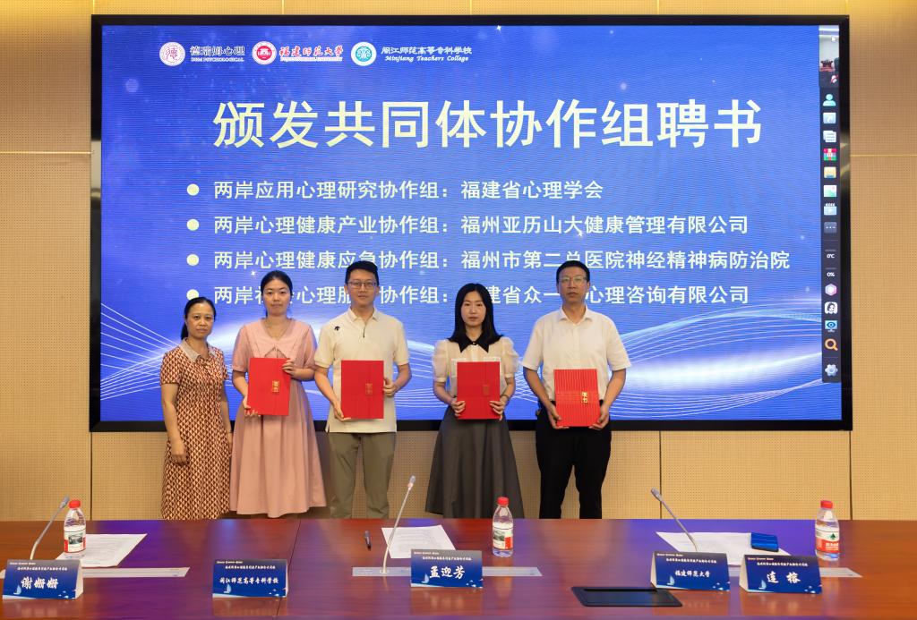 随后,会议举行授牌与聘任仪式。连榕教授、孟迎芳院长等嘉宾为新增理事单位颁发牌匾,为协作组颁发聘书。同时,共同体聘请连榕教授担任首席专家顾问,陈强秘书长为其颁发聘书。连榕教授在发言中强调,应聚焦两岸心理服务行业痛点,以产教融合推动人才培养标准化、实践应用精准化,为两岸行业协同发展提供学术支撑。