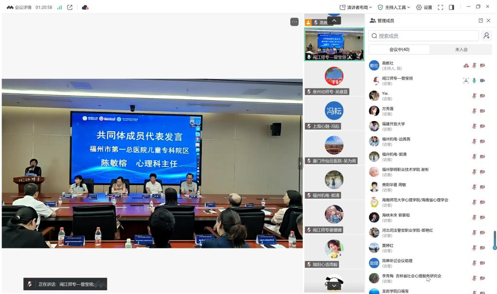 与会嘉宾河北司法警官职业学院副院长孟德新、泉州幼儿师范高等专科学校初等教育学院院长吴建荔、福州市第一总医院儿童专科院区心理科陈敏榕主任等共同体成员代表,分别从司法心理、院校培养、医疗服务等视角分享产教融合实践经验。台湾云康资讯有限公司技术长、海峡未来科技台青基地创办人郭景桓博士也在线上分享台湾地区心理服务产业创新模式,为两岸合作提供新思路。新增理事单位成员代表青岛瑞阳心语心理学应用技术发展有限公司常务副总经理周毅则从企业技术应用角度,提出心理服务与科技融合的创新路径。多元发声,凝聚两岸协同发展共识。