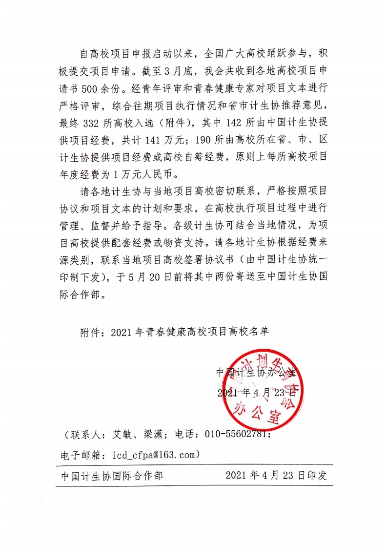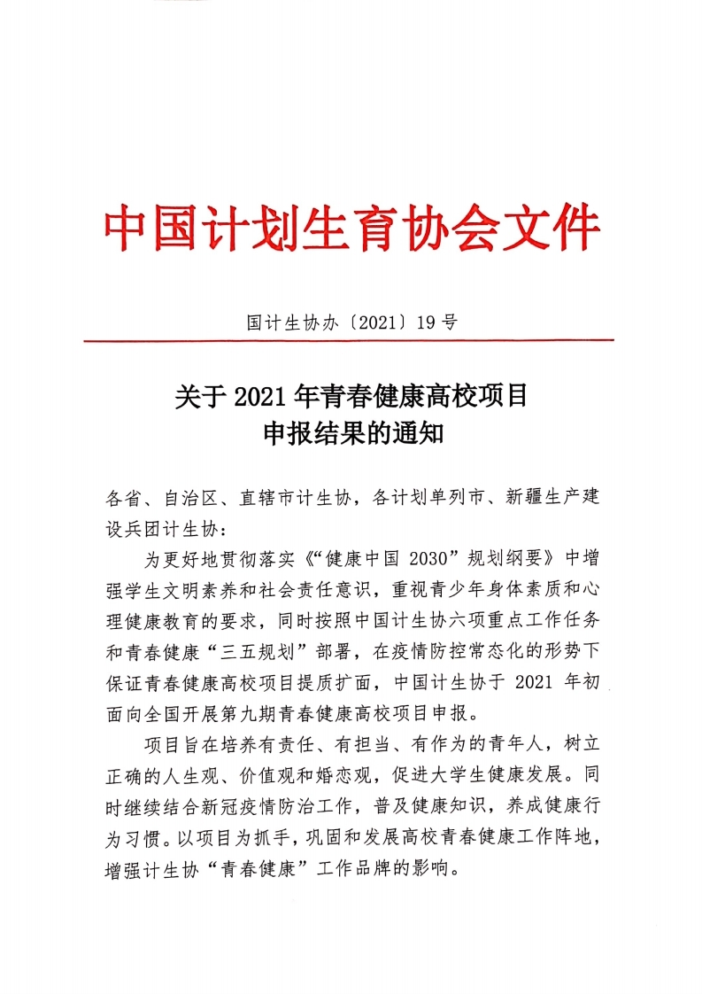 2021年4月23日,中国计划生育协会发布《关于2021年青春健康高校项目申报结果的通知》(国计生协[2021]19号),经活动评委专家的严格审核,大赢家体育app下载青春健康基地“青春健康·不负韶华”项目获得成功立项。