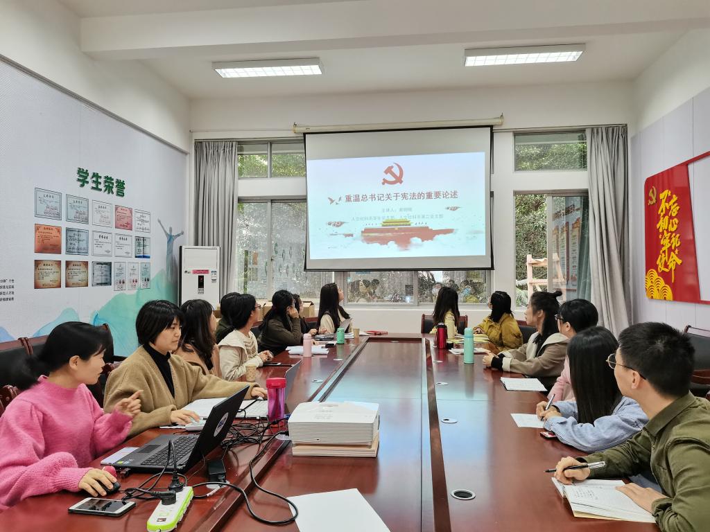11月25日,人文社科系教师第二支部与学生支部开展支部书记上党课学习活动。本次党课学习的主题为“重温总书记关于宪法的重要论述”,由教师第二支部书记谢姗姗同志主讲,二支部和学生支部全体党员教师参加。