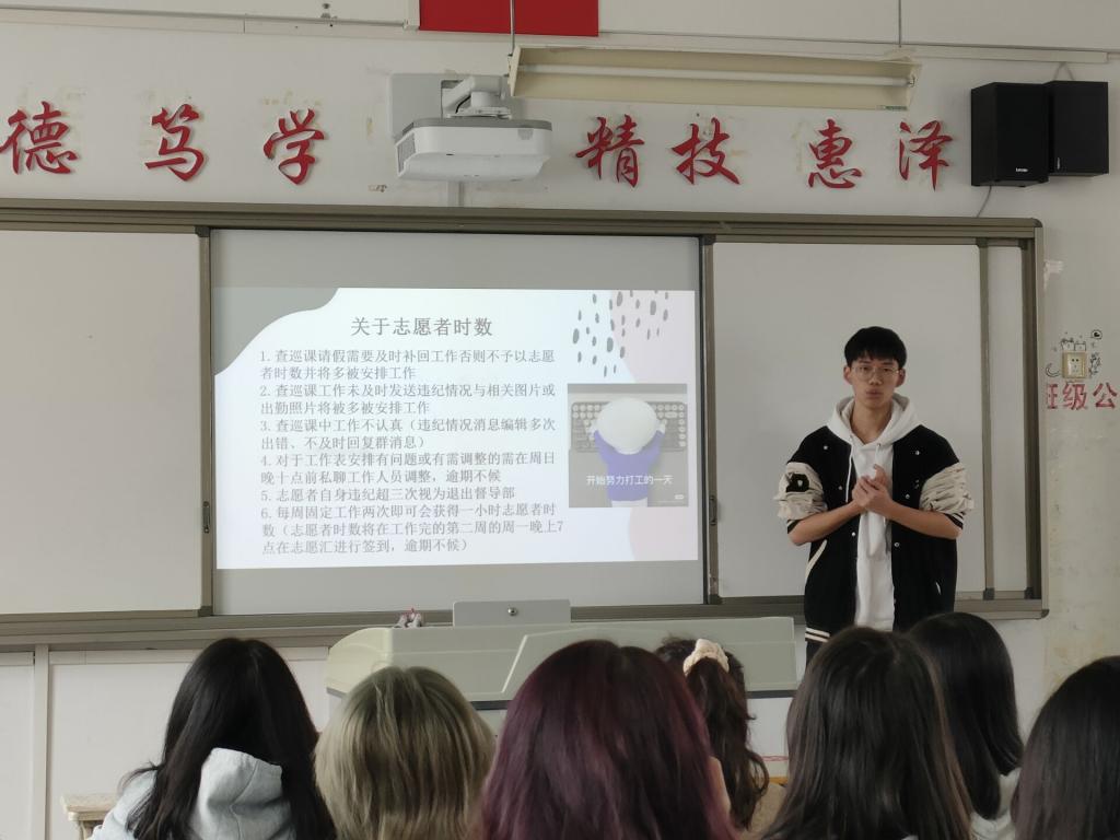 首先,由督导部拟用干事庄昕娜同学为志愿者们介绍督导部的部门情况以及工作的内容;接着,由督导部拟用干事吴婉春同学深入为大家讲解工作中违纪情况的登记与注意事项,为后续志愿者工作做好准备;最后,由督导部拟用干事翁烨同学为大家解答关于志愿者时数的问题,告知大家对待工作的态度务必严谨认真,做到以身作则。
