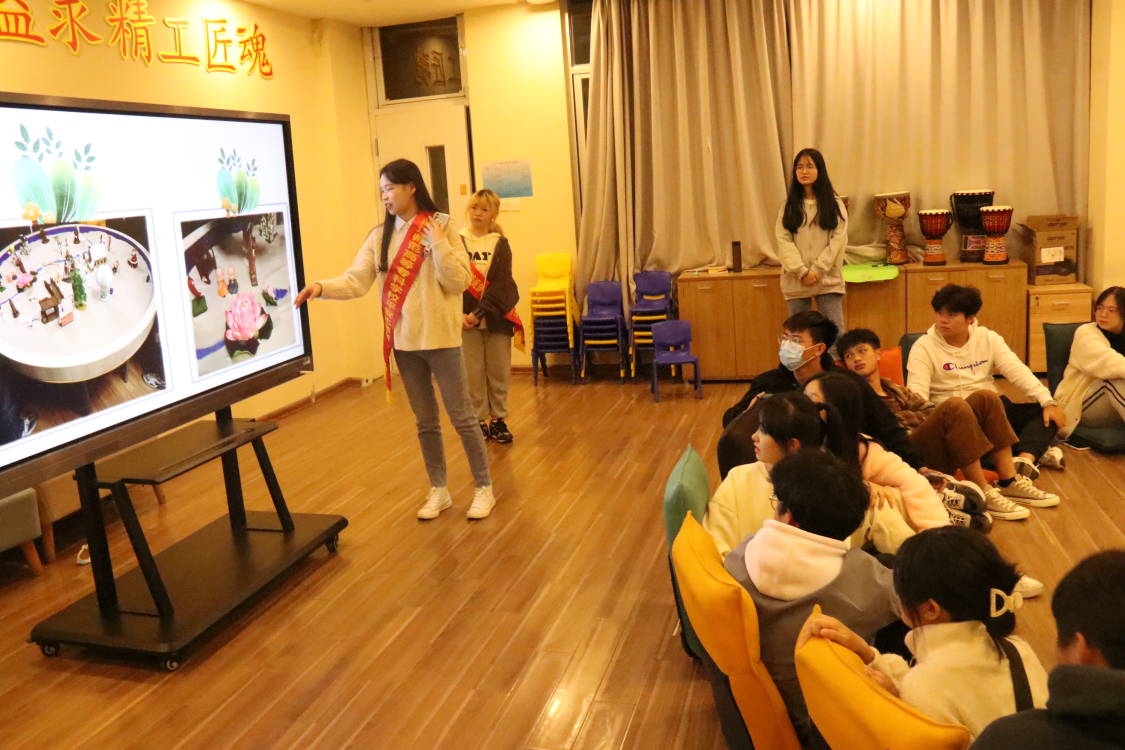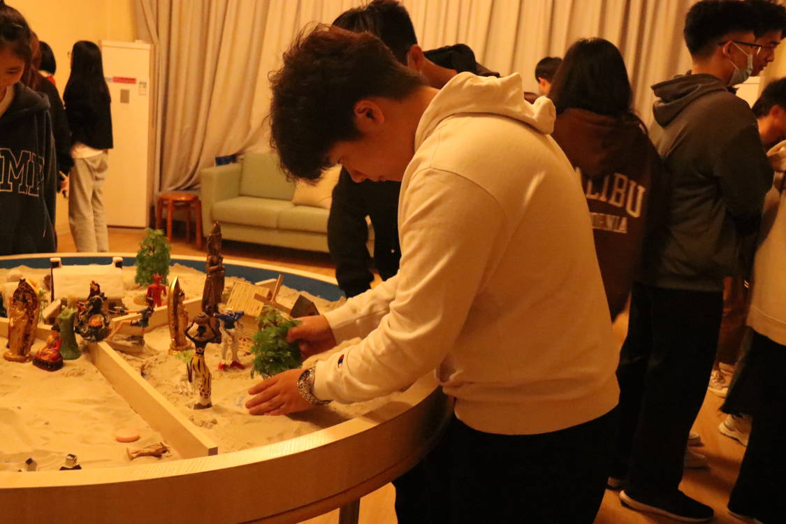 首先,主讲人通过热身活动“击鼓传花”带领心委同学们初步体验倾听和共情,带动了现场气氛;接着向同学们科普了一些关于沙盘的常识和操作,为主题活动作了准备。接下来进入主题活动“心灵绘卷——建造大家的小镇”,组织各小组按照四轮顺序,分别摆放各自的特色小镇,展现了同学们各具特色的青春风貌。最后,同学们分享了初次体验创作沙盘的感受,在分享中产生共鸣,并与自己的沙盘作品合影,圆满完成了此次活动。