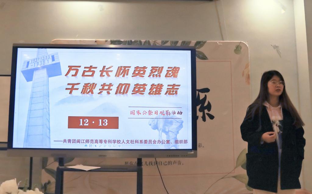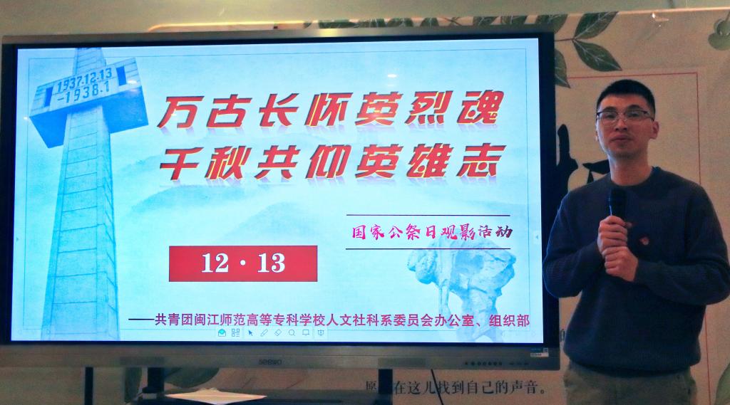 在第八个国家公祭日到来之际,为引导广大学生勿忘国耻、铭记历史、缅怀同胞,增强师生爱国主义情感。12月13日晚,人文社科系于仓山校区3号楼209教室举办以“万古长怀英烈魂,千秋共仰英雄志”为主题的国家公祭日观影活动,海口校区通过观看线上直播方式共同参与活动。人文社科系20级辅导员陈少霞老师、系学生党支部书记叶懿蛟老师、系教学秘书黄飞老师受邀出席本次活动,各班团支书及20级入党积极分子参加活动。