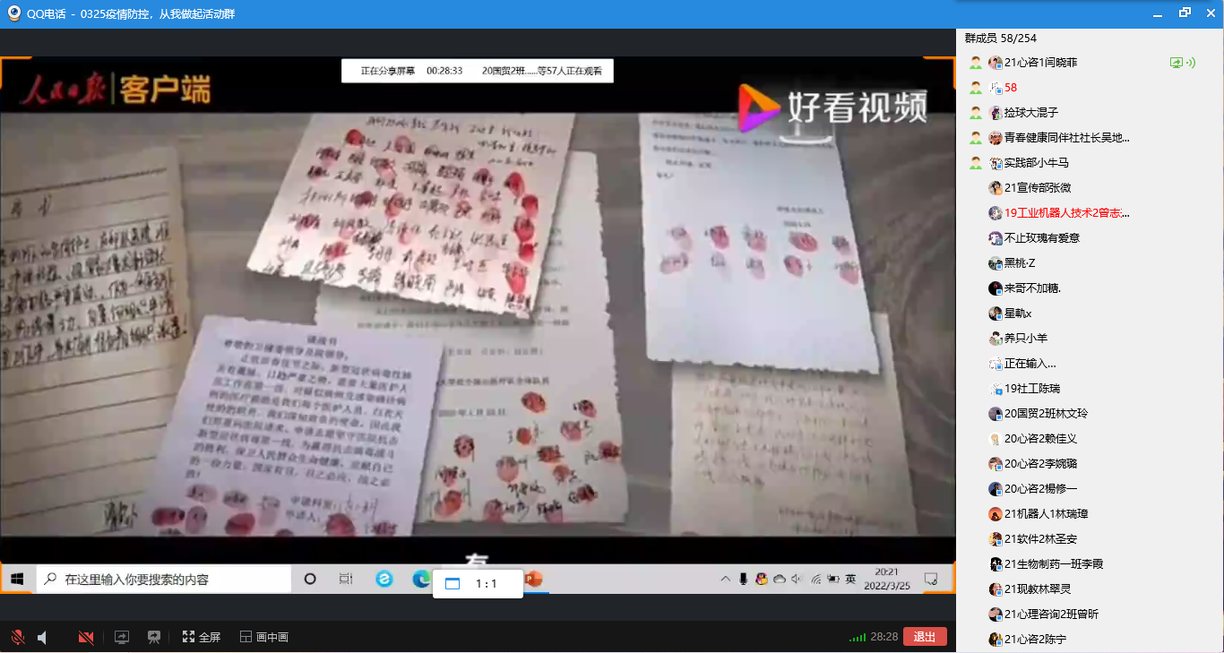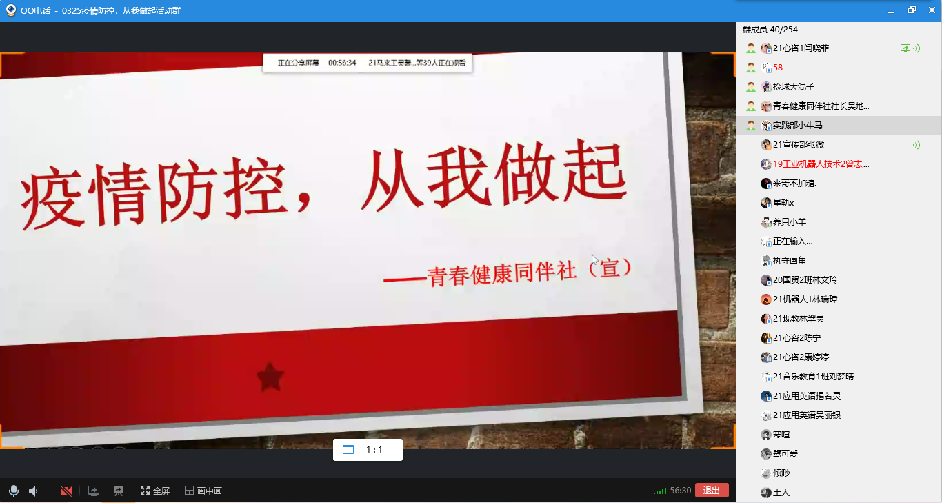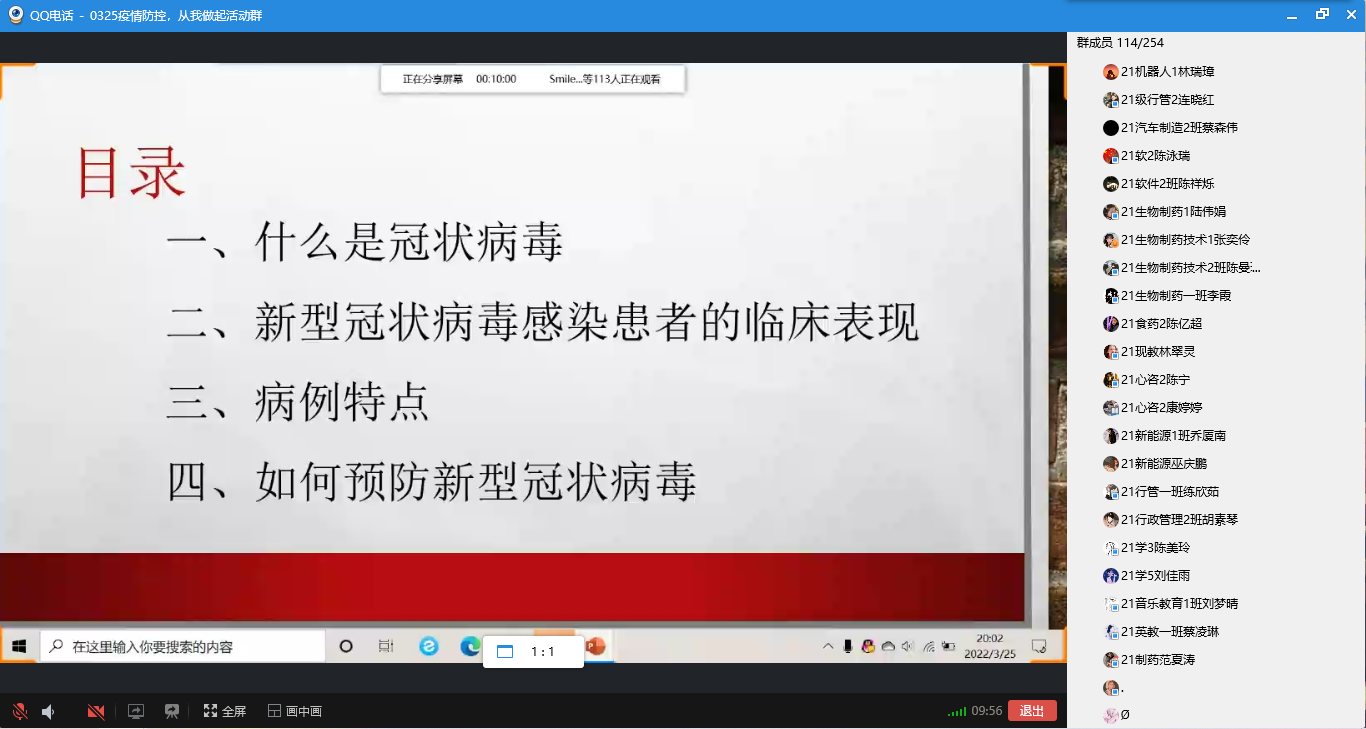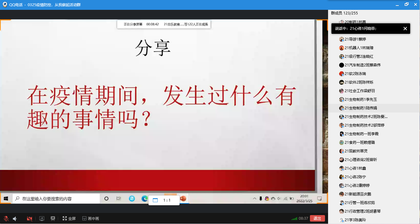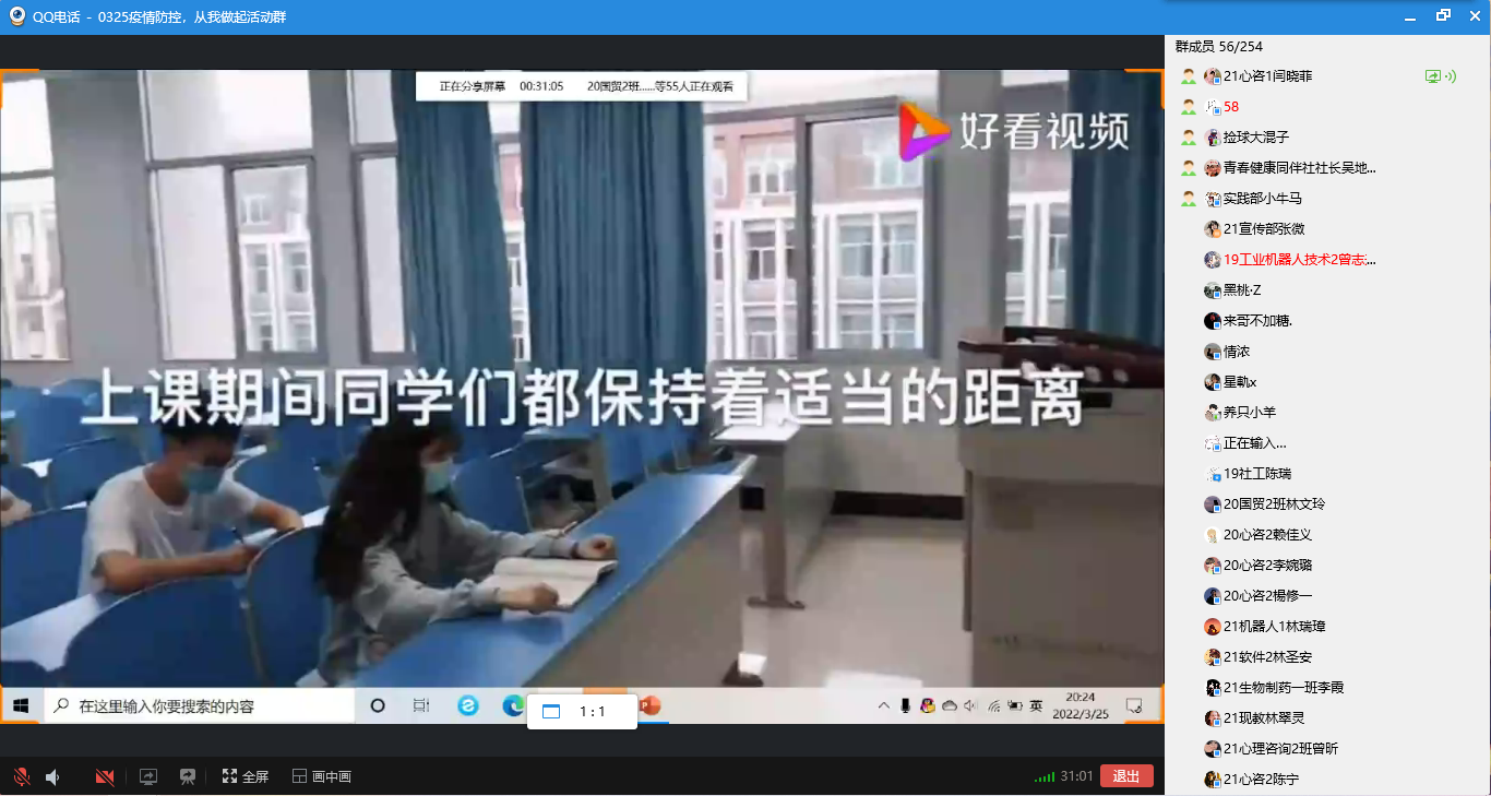 为进一步做好学校疫情防控工作,积极响应扎实开展疫情防控工作。2022年3月25-26日晚8点,青春健康同伴社在线上QQ会议举行“疫情防控,从我做起”两场线上同伴主题活动。本次活动由实践部闫晓菲和张家钰主持会议,闽江师专全体同学共同参与。