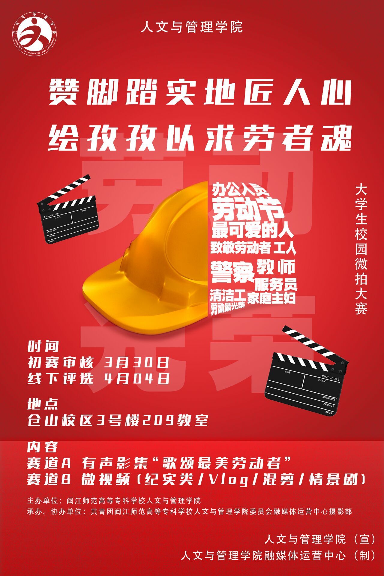 为全面提升学生的劳动素养,在劳动体验中获得健全的人格,以劳增智,以劳树德,以劳健体,让学生拥有幸福的生活能力。基于疫情防控要求,我院于4月1日-4月8日在线上开展“赞脚踏实地匠人心,绘孜孜以求劳者魂”大学生微拍视频大赛活动。