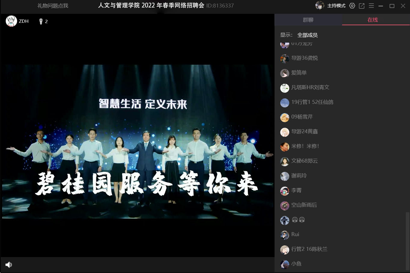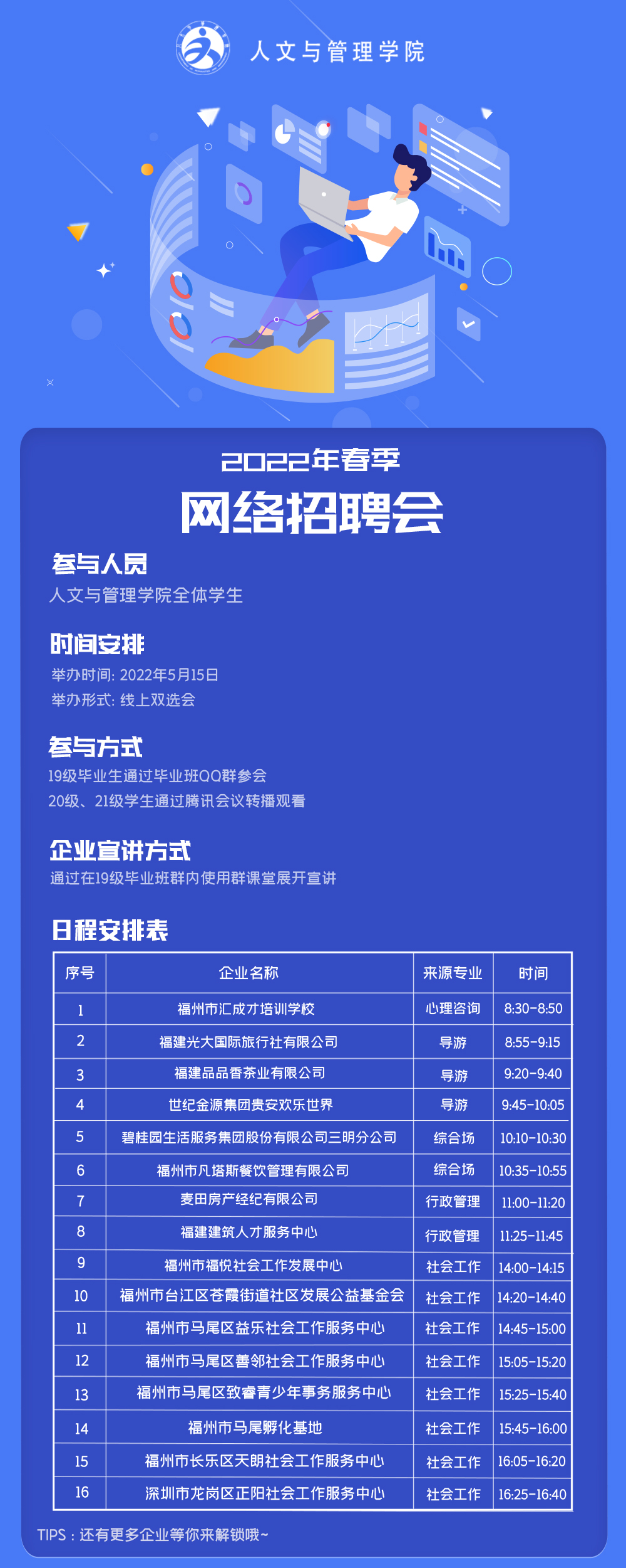 为贯彻落实党中央、国务院“稳就业”“保就业”决策部署,进一步畅通2022届毕业生就业渠道,助力我院毕业生实现更加充分和更高质量就业,人文与管理学院于5月15日举办2022年春季网络招聘会。毕业班辅导员、全体2020届毕业班学生以及部分意向获取暑期实习岗位的20级、21级学生参会。