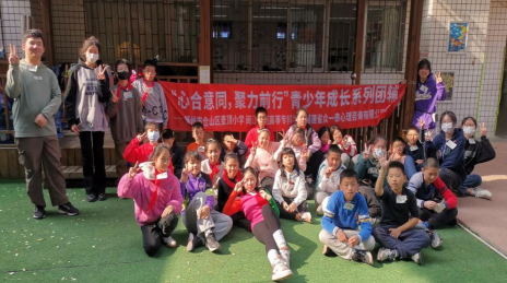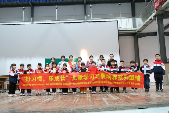 图2:心理咨询专业“绝队给力”小分队与城门中心小学小朋友合照