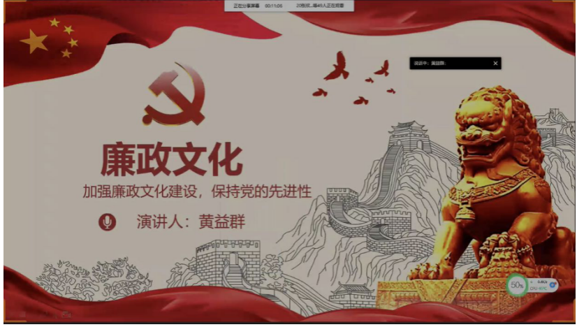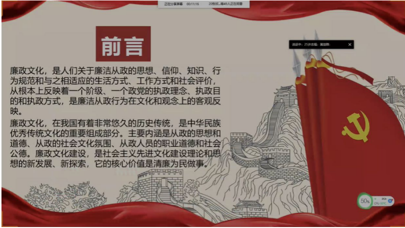 首先黄老师由廉政文化的含义以及其发展历史为引,导出班会主题“加强廉政文化建设,保持党的先进性”,随后详细阐述了新时代为什么要发扬廉政文化,怎样发展廉政文化和青年人应该树立怎样的廉政意识。结合自身经历,剖析了廉政文化重要性,并提醒同学们无论在学习、生活、工作上都要始终保持廉洁意识。还多次引用习近平总书记关于廉政文化的讲话,劝诫同学们要始终清醒、增强意识、保持高尚品格与操守。