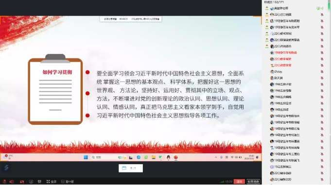 为深入开展学习贯彻习近平新时代中国特色社会主义思想,引导学生以学铸魂、以学增智、以学正风、以学促干,人文与管理学院于5月21日在线上QQ会议成功举办学习贯彻习近平新时代中国特色社会主义思想主题教育,本次活动由黄益群老师主讲。仓山校区人文与管理学院22级学生全体参加。