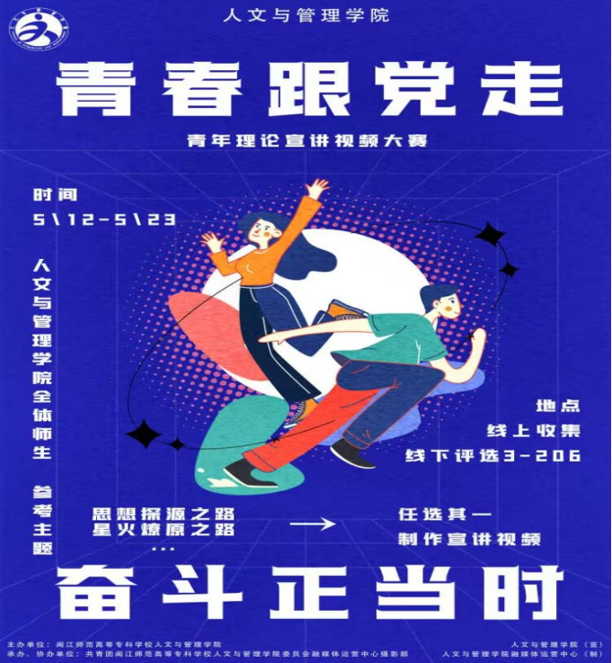 为深入学习贯彻党的二十大精神,教育引导广大青年以学铸魂、以学增智、以学正风、以学促干,推进社会主义核心价值观培育践行,坚持活动育人、实践育人、文化育人,5月12日-5月25日,人文与管理学院成功开展“青春跟党走,奋斗正当时“青年理论宣讲视频大赛,此次大赛面向人文与管理学院全体学生。