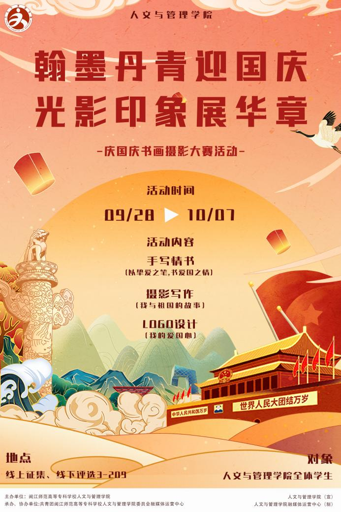 为进一步推进人文与管理学院德育工作,对学生进行深入的爱国主义教育,在迎接国庆佳节中厚植爱国主义情怀,激发民族自豪感和认同感。9月28日-10月7日,我院融媒体运营中心举办以“翰墨丹青迎国庆,光影印象展华章”为主题的庆国庆书画摄影大赛活动,采用线上比赛评比方式进行。