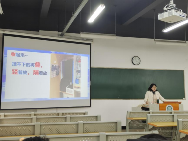 在上课过程中,祝林敏生动详细地向同学们讲述了收纳的重要性、整理的定义、整理前的准备、整理的步骤、注意事项等,并结合宿舍环境介绍收纳技巧。同学们认识到收纳不仅能培养良好的生活习惯、加强自我管理能力,还能营造良好的宿舍生活环境,提高生活幸福感。