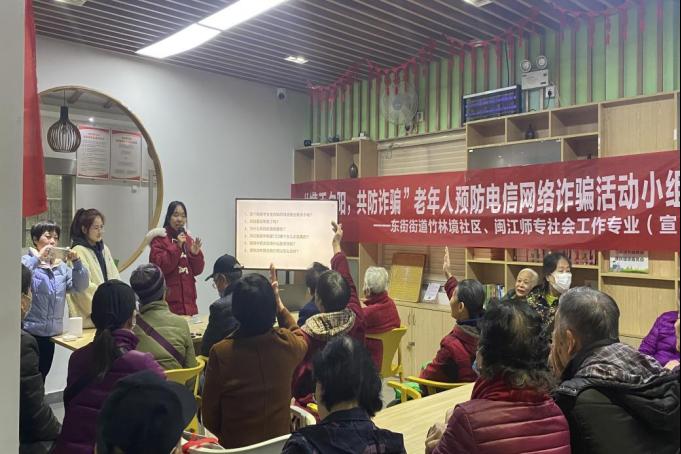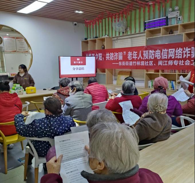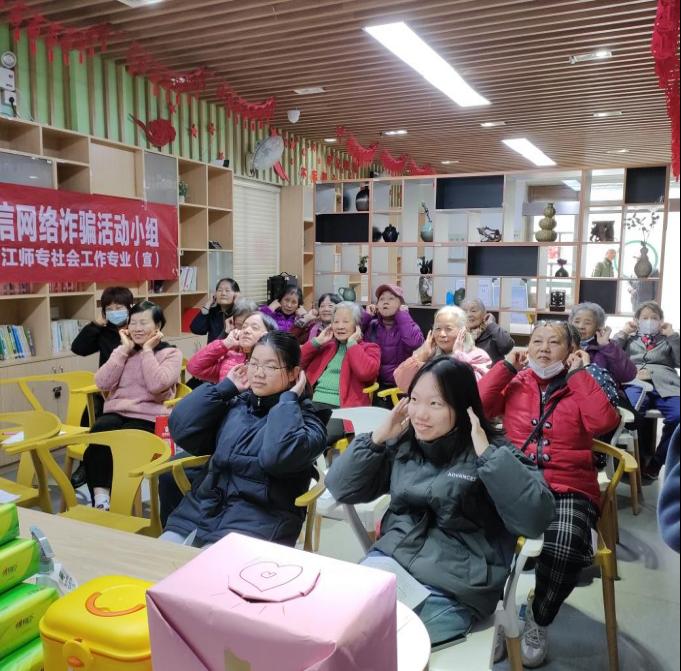 为提升社会工作专业学生实践能力,加强高校与社区之间的合作,2023年12月15日至12月27日,人文与管理学院社会工作专业学生赴竹林境社区开展“携手夕阳,共防诈骗”老年人预防电信网络诈骗小组活动,为此提高老年人防诈意识。