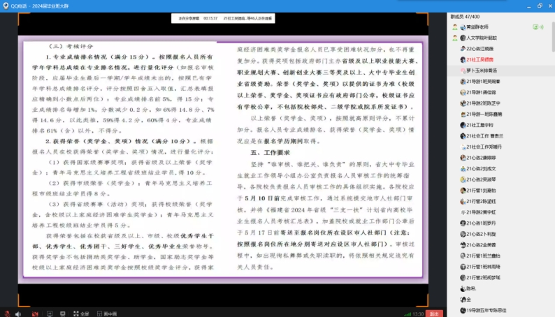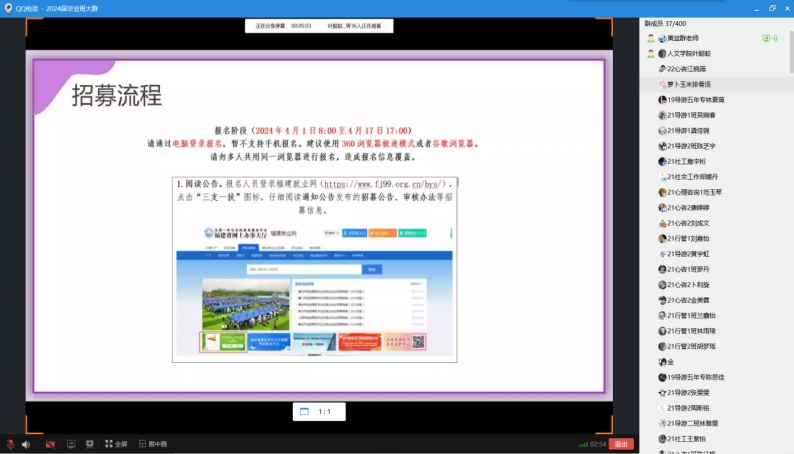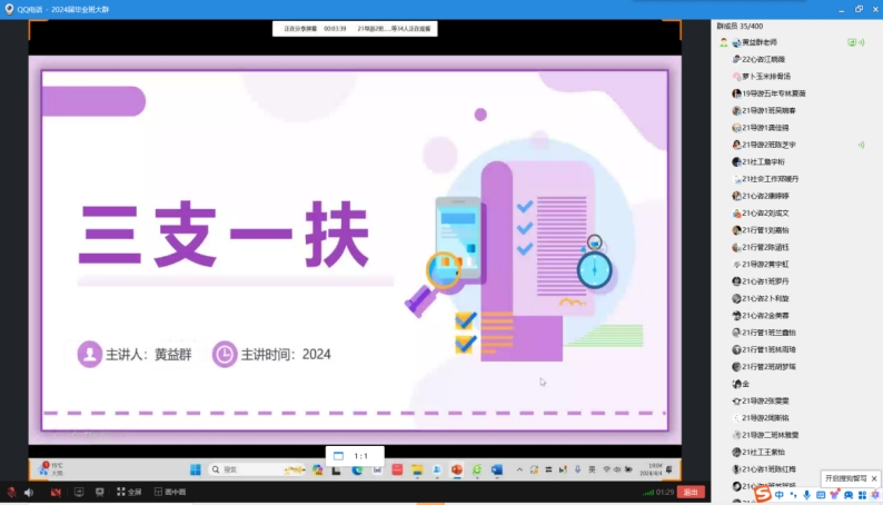 为做好毕业生就业工作,鼓励毕业生到基层锻炼,加强毕业生的实践能力,人文与管理学院于4月4日在线上成功举办“三支一扶”讲座,本次讲座由黄益群老师主讲。人文与管理学院2024届毕业生参加。