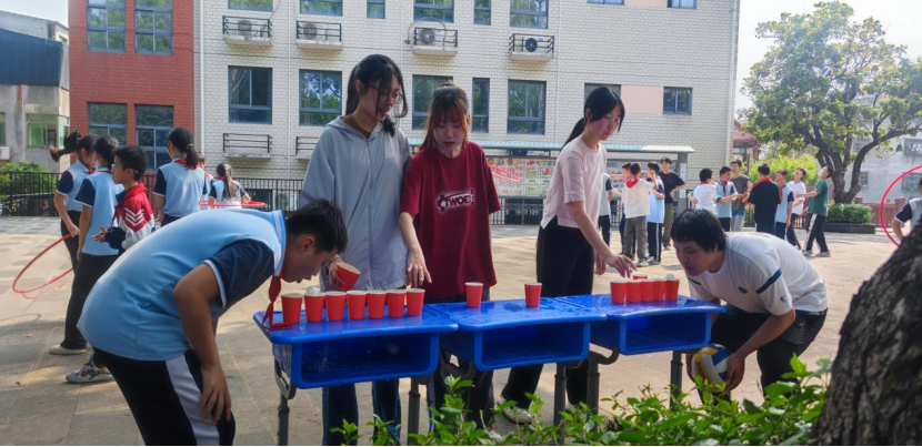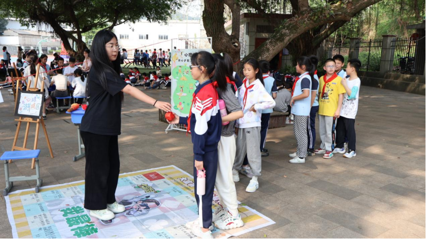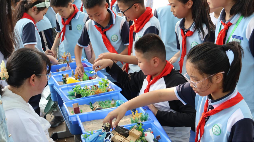 在最后的心理沙盘区和心理游戏区,心理专业同学利用包含树木、人物角色、房屋等元素的沙具,帮助小学生们探索和表达内心深处的情感和难以表达的问题。在团体活动辅导中,通过共同参与主题游戏,增强小学生们的人际交往能力和社交技巧,减少孤独感和焦虑感,促进个人成长和心理健康。