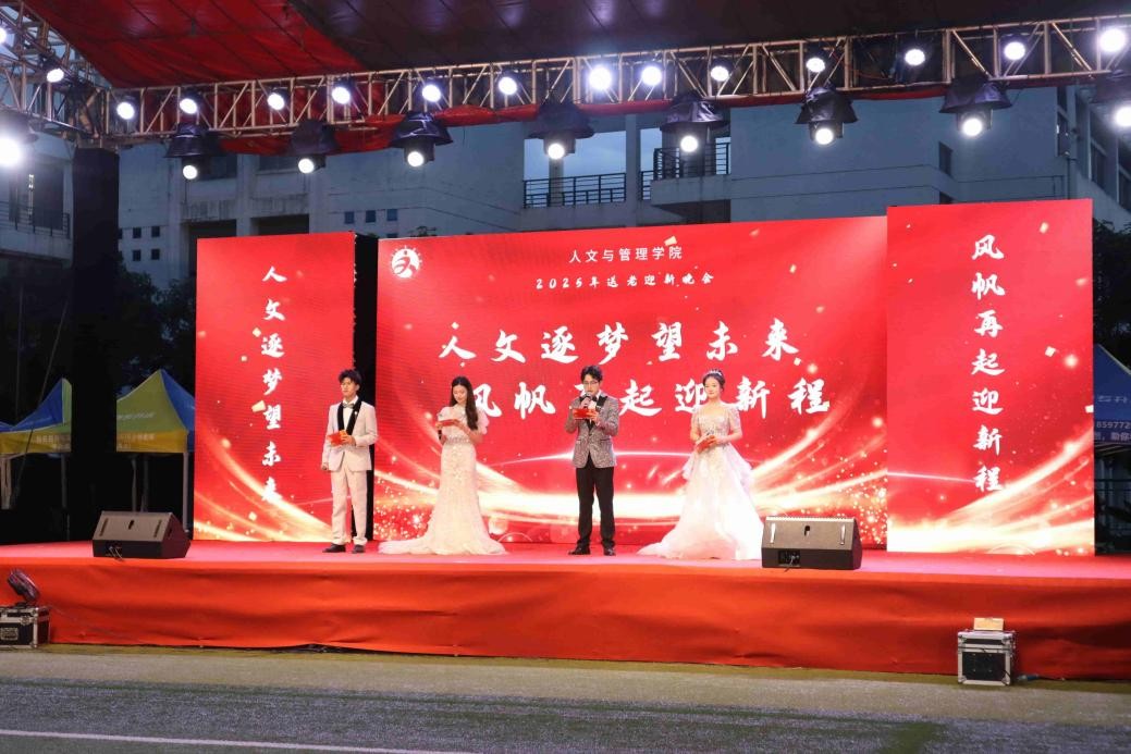 为热烈欢迎24级新生的到来,并为即将毕业的22级学长学姐们送上真挚祝福,6月12日晚上,人文与管理学院在操场隆重举办“人文逐梦望未来,风帆再起迎新程”送老迎新晚会。学校领导班子、师生代表齐聚一堂。激昂的鼓点骤然响起,炫酷的电吉他声划破夜空,一首节奏强烈的歌曲《神奇的赛尔号》震撼开场,瞬间点燃全场热情,观众们随着节奏挥舞双手,欢呼声此起彼伏。随后,舞蹈、歌曲、小品、情景剧等节目轮番登场,形式多样、内容丰富。此外,晚会还设置了抽奖环节,不仅为观众带来了意外惊喜,更将现场气氛推向新的高潮,编织毕业纪念与迎新期许交织的美好篇章。