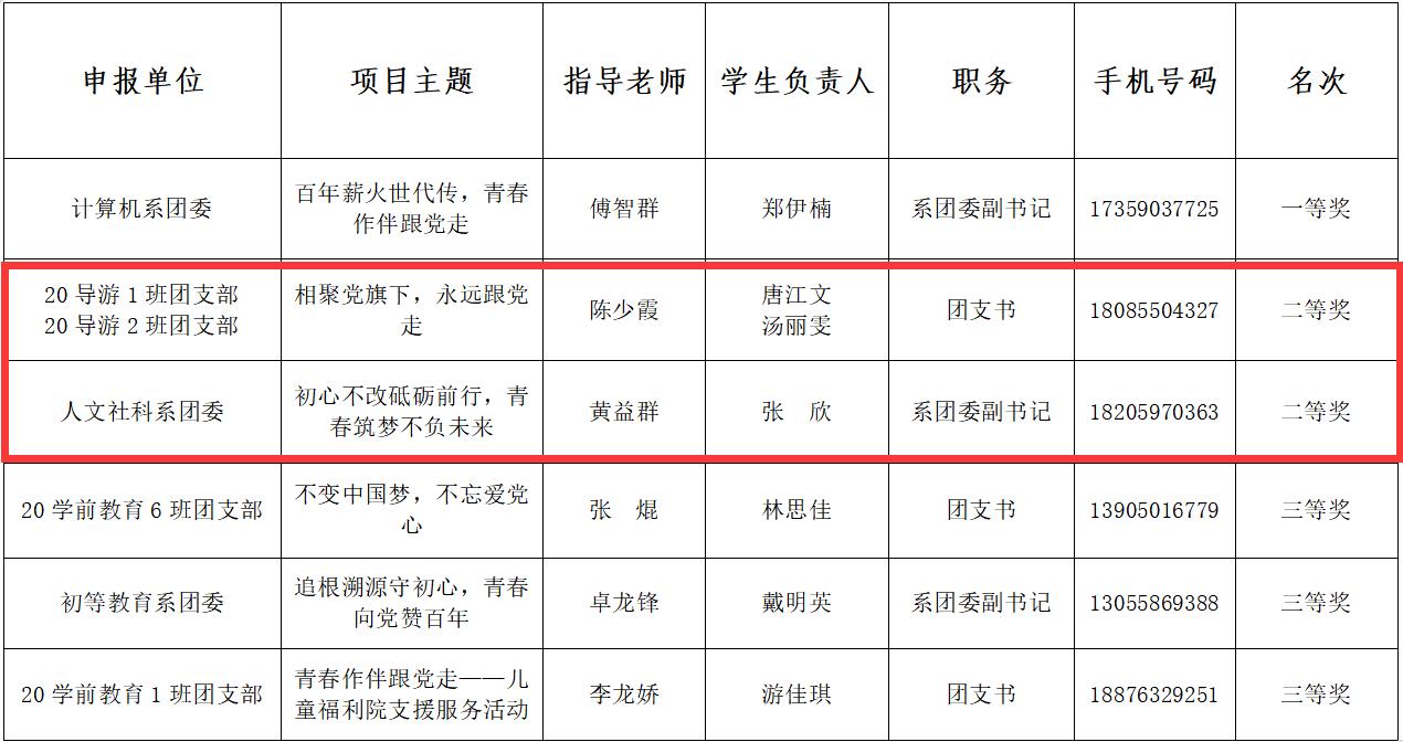 在此次汇报会上,各支部借助ppt或视频分享了各班围绕主题开展的一系列团日活动,各支部以组织同学参观红色历史景点、举办党史知识竞赛、前往周边小学进行党史主题宣讲等多种不同形式的活动去诠释主题。经过评比,最终人文社科系团委、20导游1、2班团支部荣获得二等奖。
