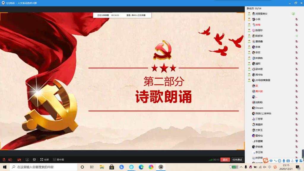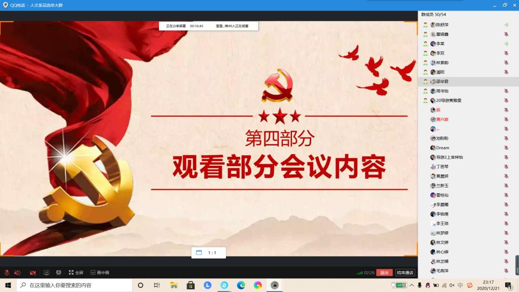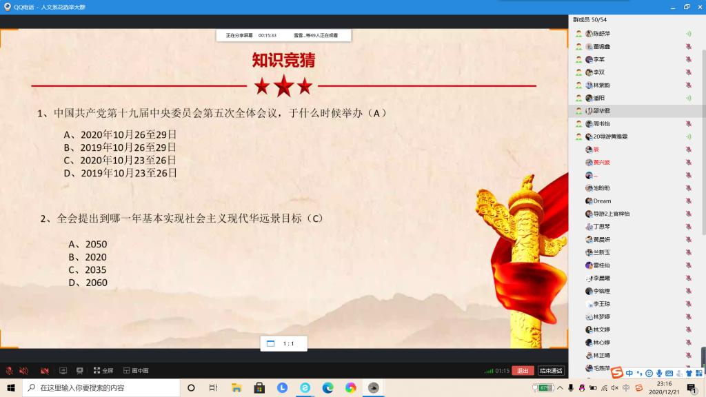 为了学习十九届五中全会精神知识,为了号召同学们学习贯彻十九届五中全会精神,12月19日19:00晚,20级专业2游班开展了以“学习贯彻十九届五中全会精神”为主题的日活动,本次活动由20级游班团支书汤丽雯主讲。