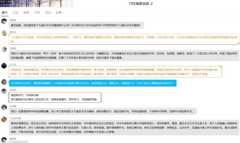 本次线上团日活动以一首激情高亢的共青团团歌拉开序幕,紧接着团支书曾梅与团员们分享了一个视频,让同学们深刻理解了青年学生学习贯彻党的十九届五中全会精神的重要性。随后,团员们展开对“如何学习十九届五中全会精神”的讨论,团员们各自分享自己的见解及领悟到的精神,踊跃发言。从多个方面展示了十九届五中全会所传递的精神。
