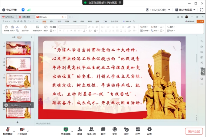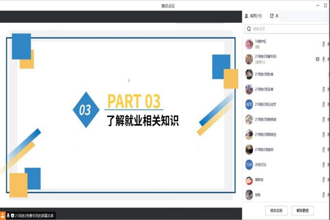 为深入学习贯彻习近平新时代中国特色社会主义思想,深入推进共青团促进大学生就业行动,聚焦就业思想引领,引导大学生树立正确的择业观和就业观,促进大学生更加充分更高质量就业,11月30日,人文与管理学院21级导游专业、行政管理专业团支部于线上腾讯会议成功开展“赓续红色基因,同心共筑就业梦”主题团日活动,各支部成员共同参与此次活动。