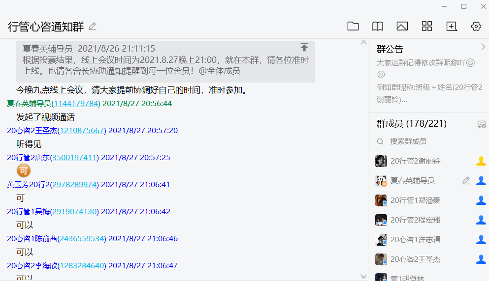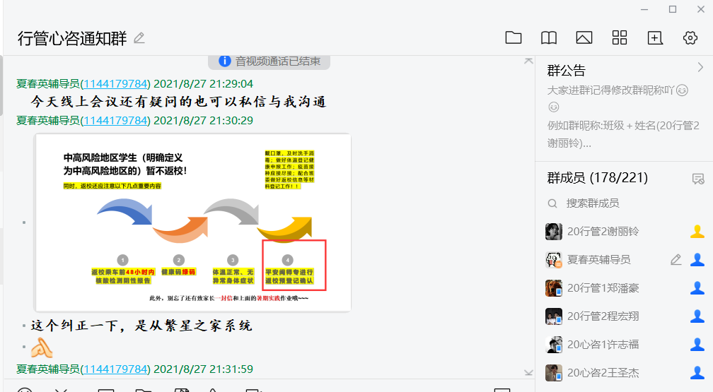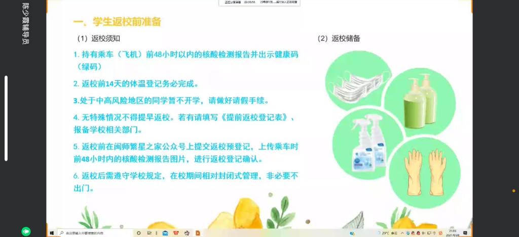 此次开学前的线上会议,两位辅导员首先介绍当下国内外疫情形势的严峻情况,提高同学们的防疫意识。同时根据上级防疫部门要求,学校严格遵循“中高风险地区暂不返校”的防疫原则,告知低风险地区的同学们返校需做好报到前48内的核酸检测,并做好每日的健康申报工作,希望同学们届时能够平平安安返校、开开心心上学。此外,辅导员还为同学们详细介绍了劳动教育课程开设的指导思想与预设方案,以此在同学们心中树立劳动光荣的思想观念。最后,辅导员预祝同学们新学期好好学习、天天向上,鼓励大家向新的更好的自己出发!