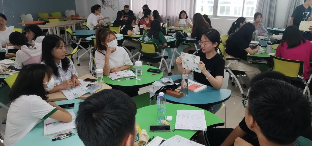 其次,翁洁老师通过“表达性艺术治疗”体验式教学活动设计《小乌龟摘果记》,帮助同学们探索自己的“成长目标”,分析个人可能面临的成长“困境”和惯用的“因应模式”,鼓励同学们在团体“分享‘绘’”中整合个人内外积极的资源,加深自我觉察,做出新学期的新决定。