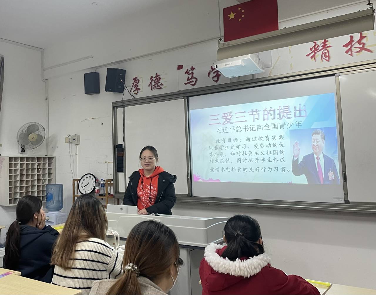 在此次专题活动过程中,叶懿蛟老师提出“三爱”的含义“爱学习、爱劳动、爱祖国”,由“爱学习”向“爱祖国”延伸,着重强调了同学们应把个人的学习成长和国家的前途命运结合起来,不断升华对“三爱”的理解和认识。周海英老师指出当代大学生与“三爱”的密切关系,并且通过具体事例强化同学们对“三爱”的思想观念,表示只有将三爱精神内化于心,外化于行,才能将其真正贯穿于未来的学习生活中。