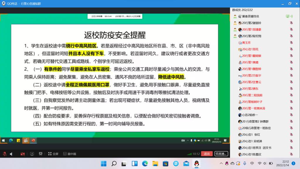 在本次“返校安全”主题会议中,辅导员们首要强调的是返校途中的注意事项,引导同学们在返校途中要做好疫情防控工作。坚持“不审批、不返校”的原则,并强调学生返校途中要全程正确佩戴医用口罩,绕行中高风险地区;随时关注自己的健康码情况,有条件的尽量乘坐私家车返校,降低途中风险。其次辅导员们强调到校后也要做好校园疫情防控工作,需正确佩戴口罩,自我察觉发热或异常症状及时报告,配合疫情防疫要求。