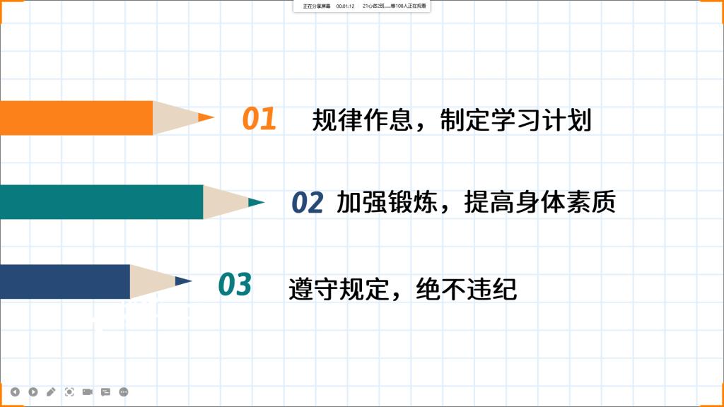 会上,两位老师通过PPT屏幕分享的方式与同学们进行交流,重申在校疫情防控规定以及校规校纪,提醒学生做好体温登记健康申报工作,严格遵守外出请假制度,引导同学们积极调整作息时间,制定学习计划,尽早进入学习状态。此外,两位老师还从防诈骗、交通安全、食品卫生安全、用电安全等方面开展安全教育。