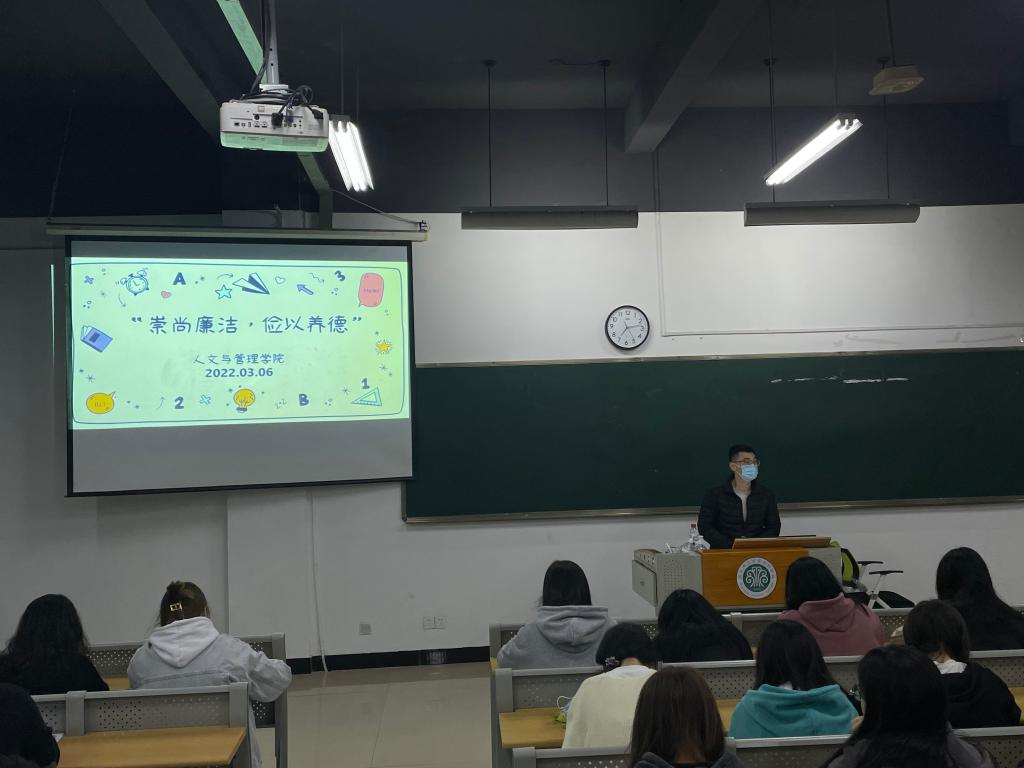 1. 为宣传廉洁文化,普及廉洁知识,营造崇廉尚洁、风清气正的良好氛围,3月6日,人文与管理学院2021级开展“崇廉尚洁,俭以养德”主题教育,此次活动在仓山校区和福清校区同时进行,由叶懿蛟老师和周海英老师主讲。