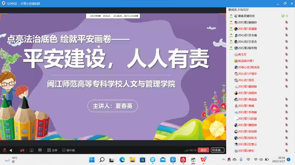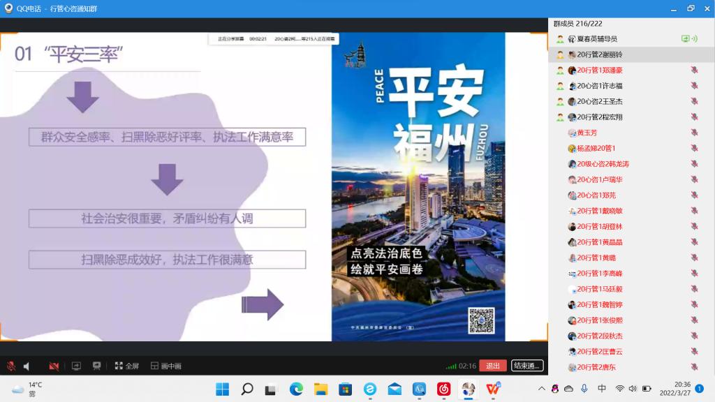 3月27日,为宣传展示平安福州、法治福州建设成果,持续鼓浓平安建设共建共治共享的浓厚氛围。大赢家体育app下载人文与管理学院20级辅导员夏春英和陈少霞老师在线上进行“平安建设,人人有责”主题教育。