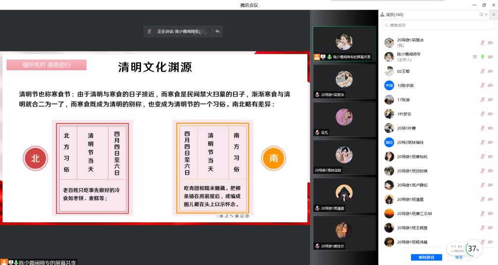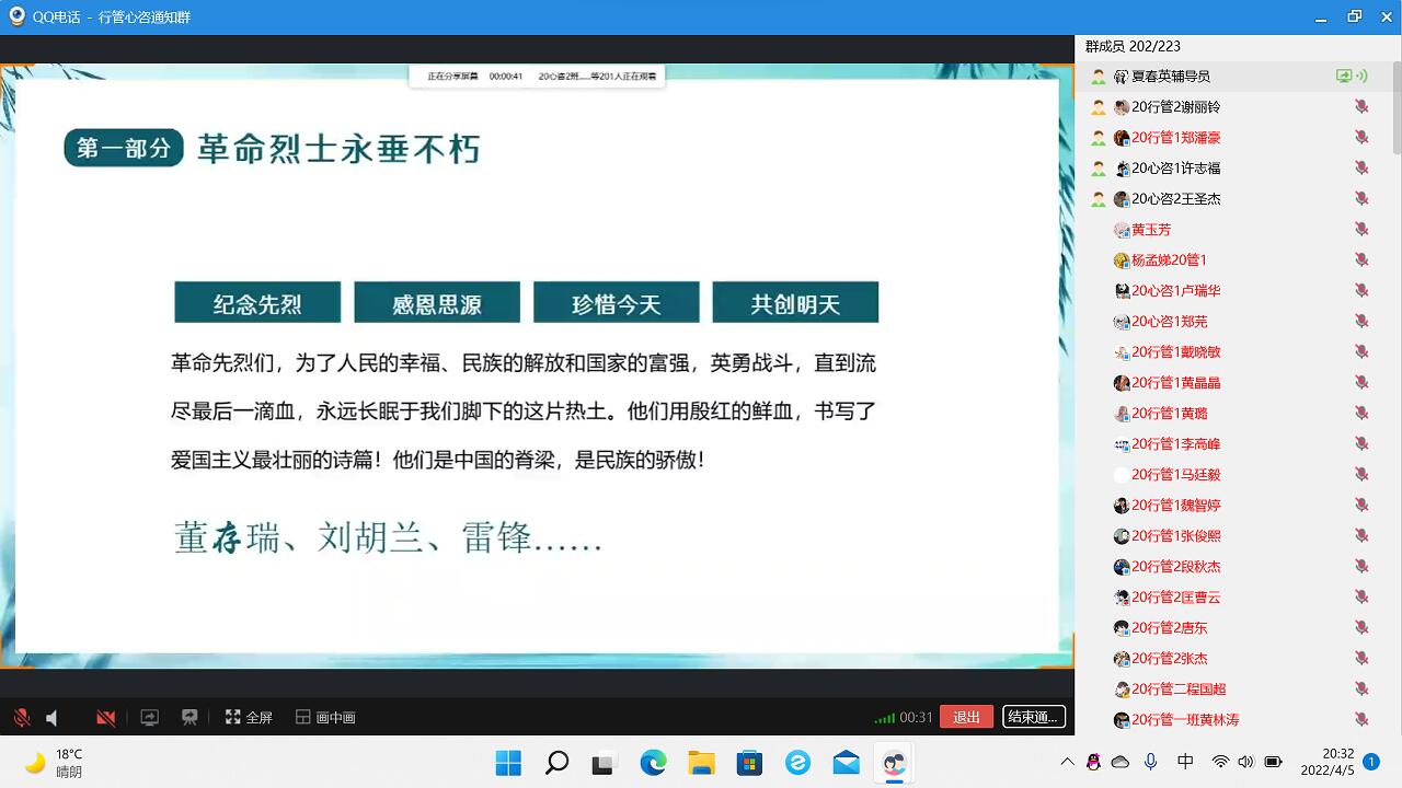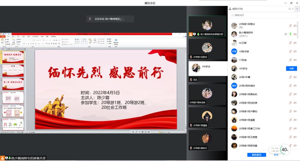 习近平总书记指出,一个有希望的民族不能没有英雄,一个有前途的国家不能没有先锋。为深切缅怀革命先烈丰功伟绩,追忆革命烈士光辉历程。清明节来临之际,基于疫情防控要求,4月5日晚,人文与管理学院2020级辅导员陈少霞老师和夏春英老师在线上腾讯会议开展“缅怀先烈,感恩前行”的主题教育活动。