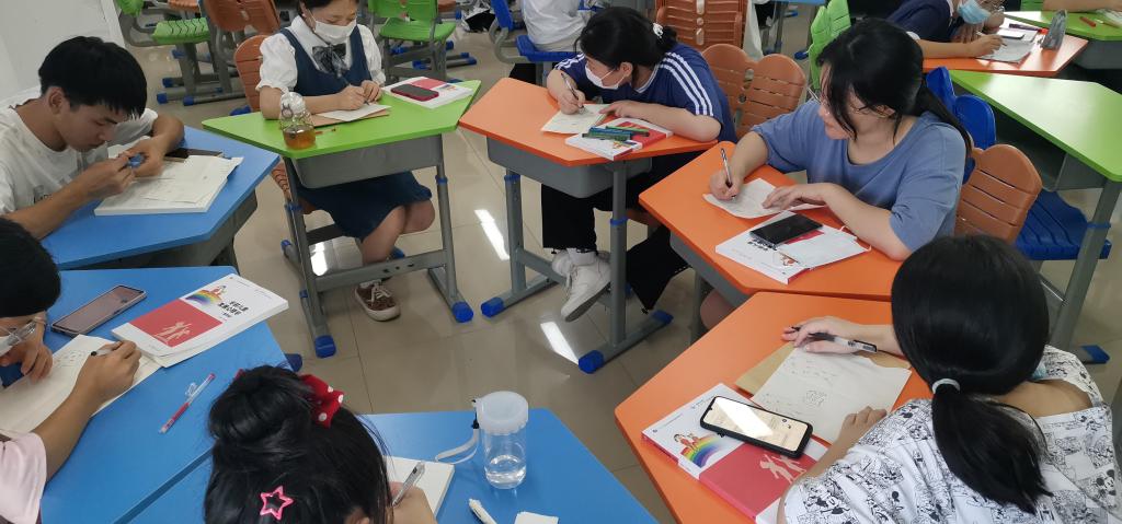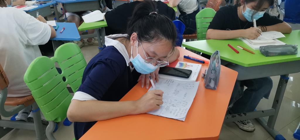 活动中,翁洁老师向同学们介绍了本学期即将迎来的专业核心课,说明了不同课程的要求和重难点,提供了学法指导,鼓励同学们积极参与到课程实践活动、日常实训练习,做好关于参赛与考证的规划,强调线上线下混合式教学模式的课程纪律和规则,要求全体同学都能按每周的教学进度完成日常作业和网络学习。之后,翁老师带着大家开展表达性艺术辅导活动《小乌龟摘果记》,画出想吃果子的小乌龟如何克服困难找到办法实现了自己目标。在舒缓的音乐声中,大家用心绘制属于自己的心灵故事,通过分享环节,同学们看到不同的人在叙事中投射出的个人经验,大家总结了人们在追求目标的过程中可能会遇到来自目标本身的阻碍,通过故事的投射,帮助大家挖掘自身面对所追求目标的态度和方法,从自我梳理、自我觉察中寻找突破自我、改变自我的新路径。