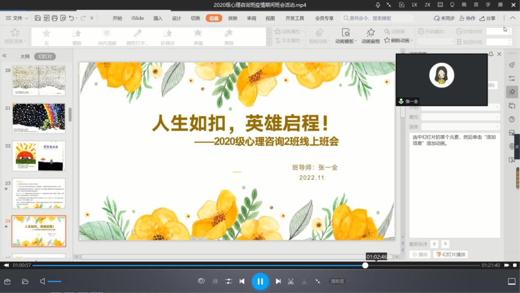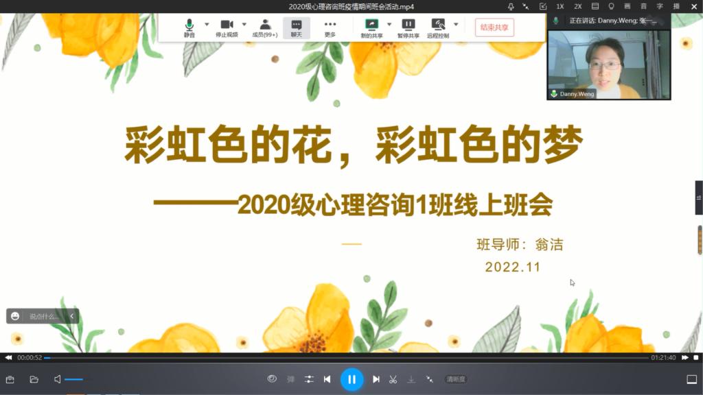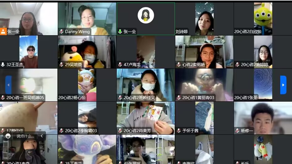 2022年11月10日晚20:30,2020级心理咨询1班、2班共同召开线上主题联欢班会,让两班同学欢聚一堂,共享暖心盛宴。1班班主任翁洁老师和2班班主任张一全老师通过绘本故事汇,将“关系与爱”的议题贯穿于主题班会之中,分别设计了“彩虹色的花,彩虹色的梦”和“人生如扣,英雄启程”的表达性艺术治疗团体辅导主题活动,共同带领大家成长,击穿疫情的阴霾,暖心相聚云端。