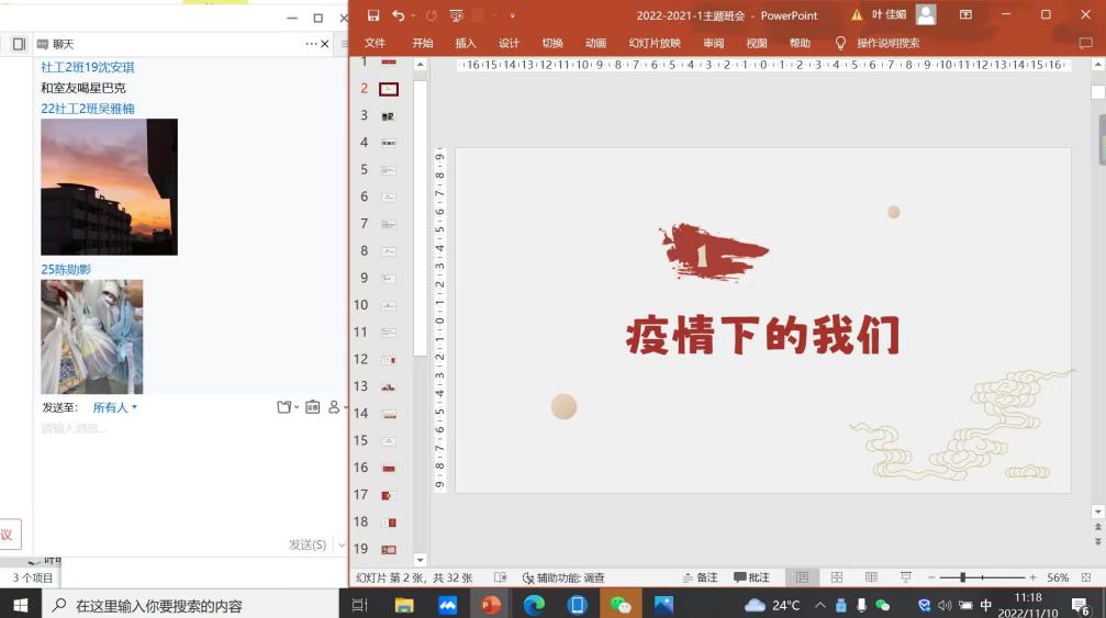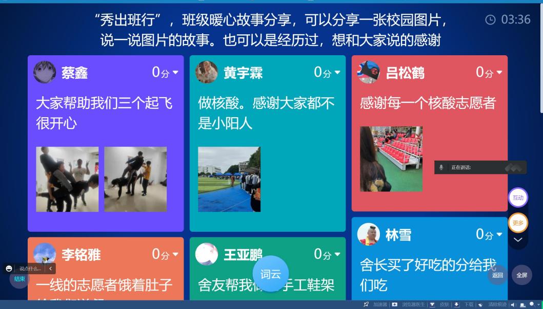 在2022级的班会上,通过组织同学们分享自己的在校日常,叙说自己的感受和烦恼,班主任们积极回应同学们的感受,鼓励大家共同携手攻克难关,每一个配合防疫工作的我们,守护的都是我们平凡而又珍贵的生活。