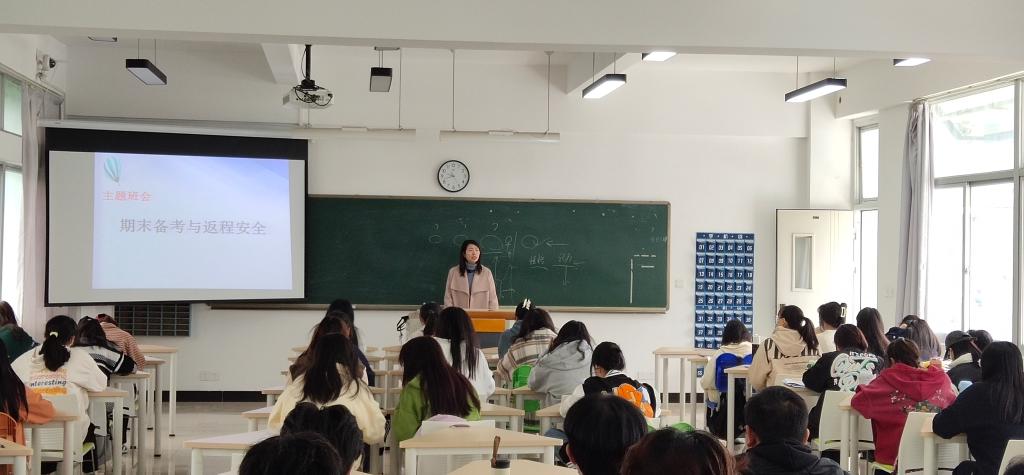 活动中,张宝英老师对本学期课堂出勤率、抬头率、点头率以及日常表现对班级学风情况进行总结分析,细致讲解了学风对学生个人成长、班级建设的作用。强调全体成员做好个人期末复习安排,及时关注班级群关于期末的通知。宣读考试违纪的相关规定,对于考风考纪问题向学生们提出了明确的要求,引导和教育学生自觉遵守考试纪律。最后,根据期末返乡的工作安排,叮嘱同学们要在返乡途中注意人身安全、交通安全和财产安全,加强疫情防控,离校前查明各属地疫情防控政策,做好属地报备,做好个人健康安全自我防护,做到平安返乡。