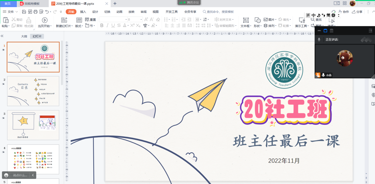 时间执笔,描绘青春岁月。在毕业生即将离校实训之际,20社工的班主任余晶老师与20社工全体同学在腾讯会议举行“班主任最后一课”主题班会,为即将走向实习岗位同学们注入力量,留下美好的学习回忆。