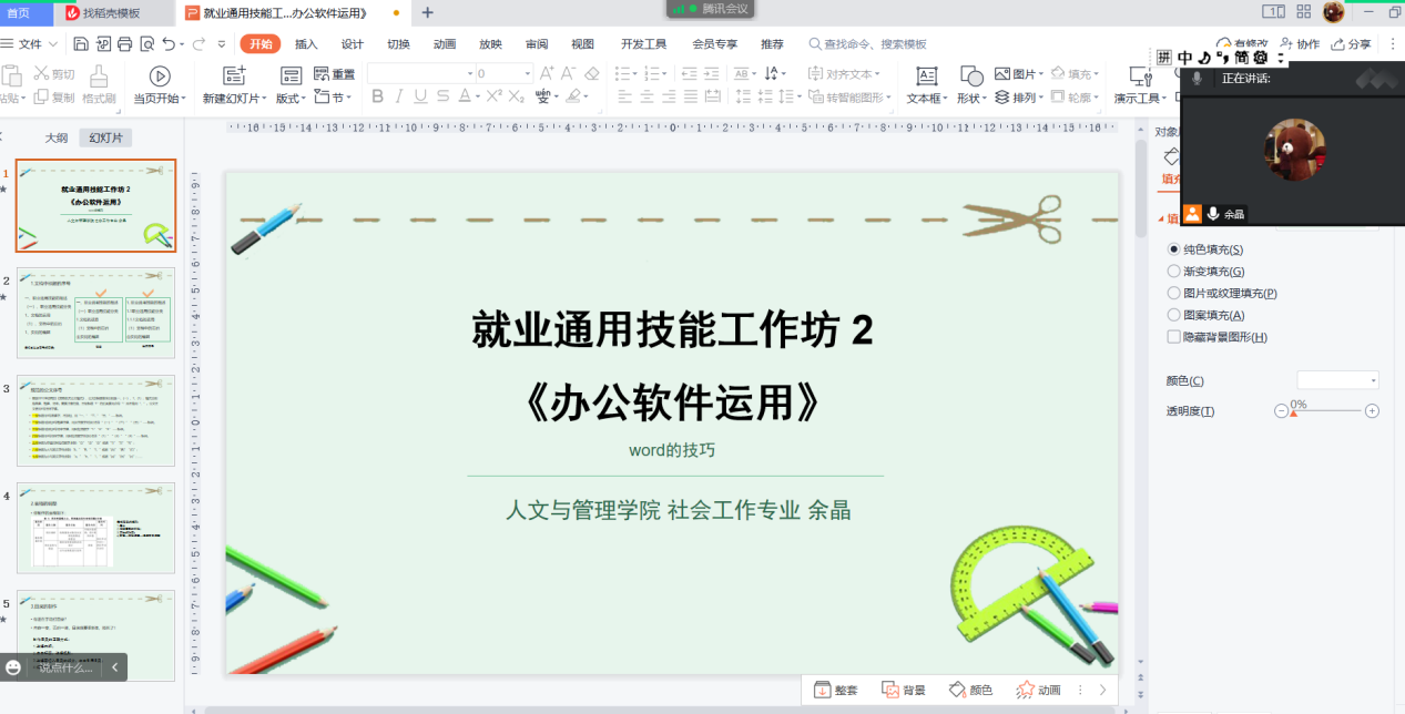 为了提升20级社会工作专业班就业技能,社会工作专业于2022年11月7日至18日,运用腾讯会议开展五场线上就业通用技能系列工作坊。本次系列工作坊紧紧围绕同学们的实习和就业岗位的需求,从制作一份好的简历、做一段漂亮的自我介绍以及相关的工作技能出发,为同学们求职就业做好心态和技能的准备。